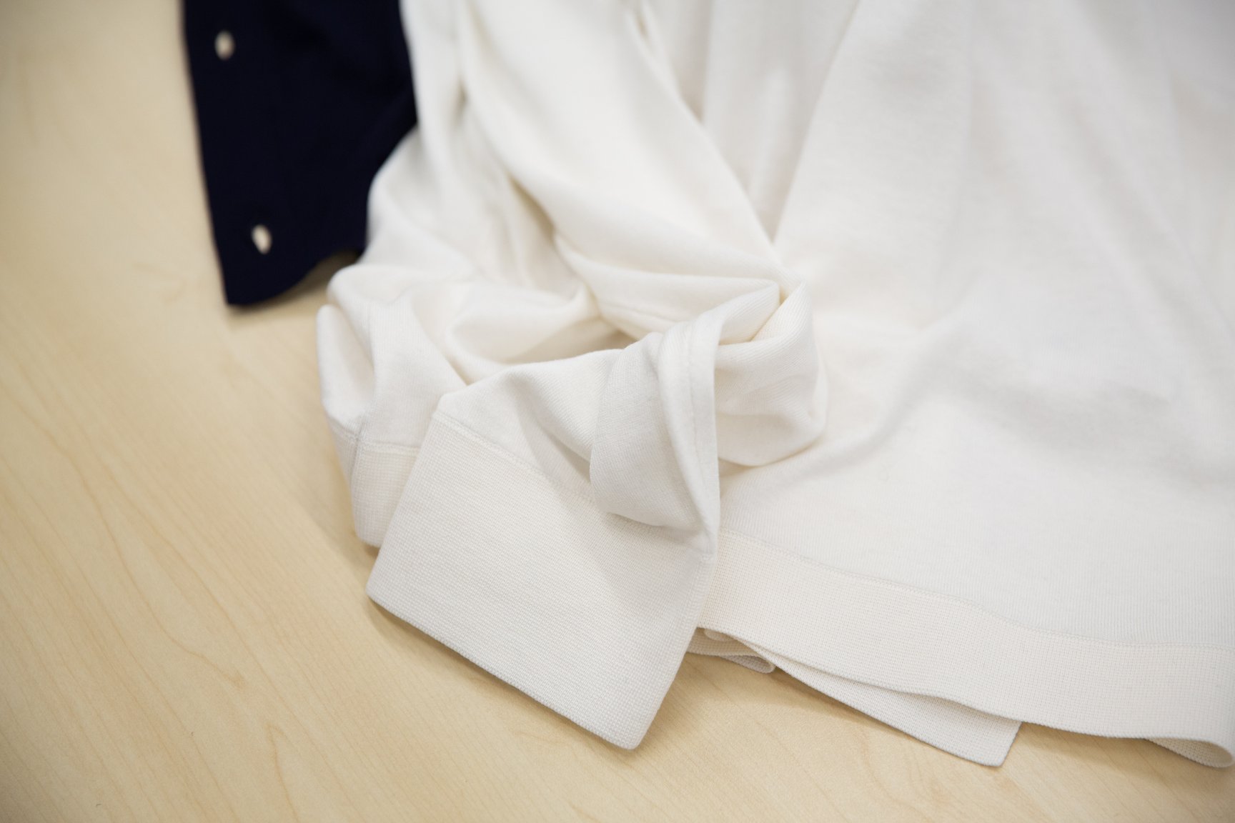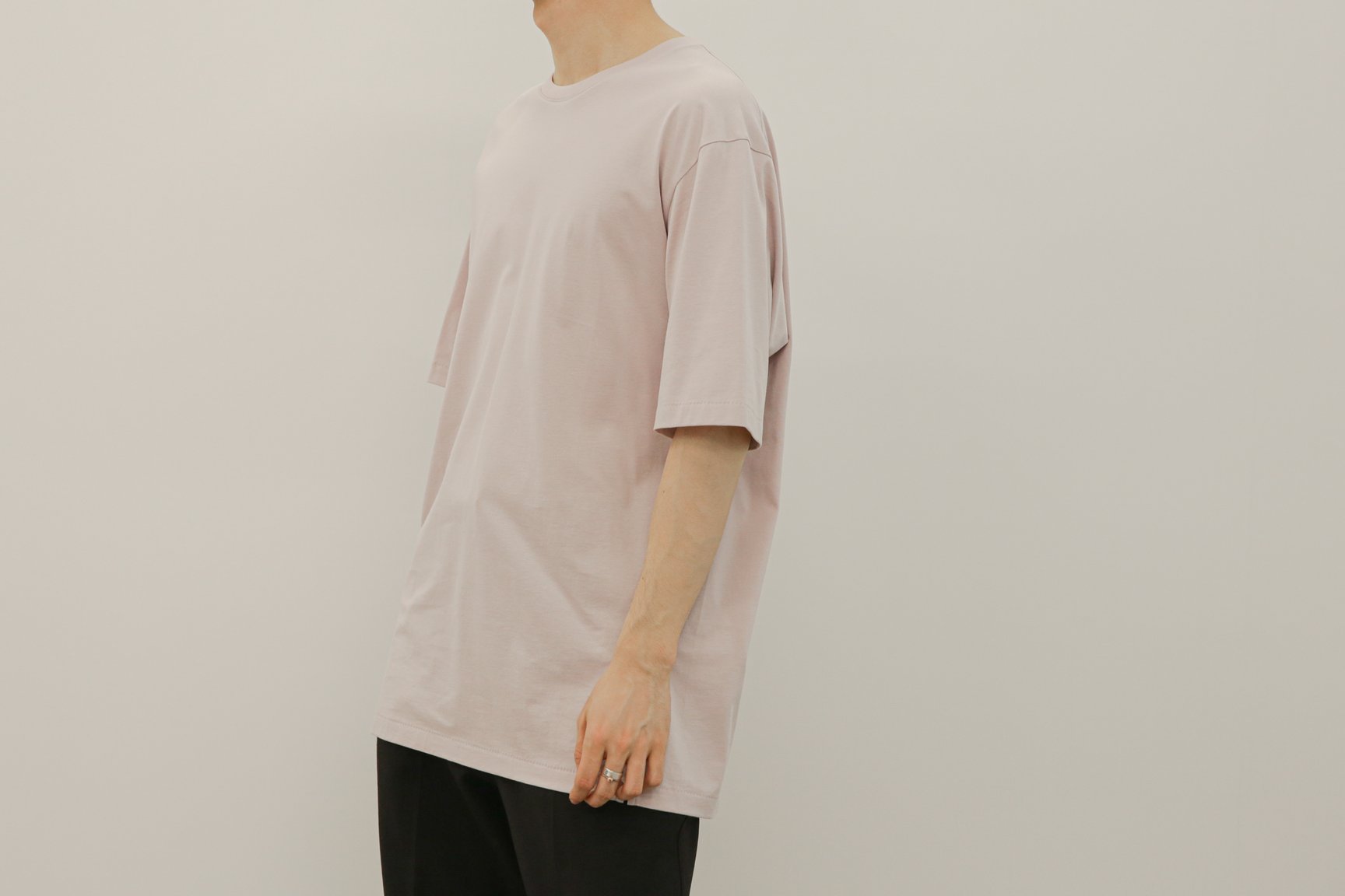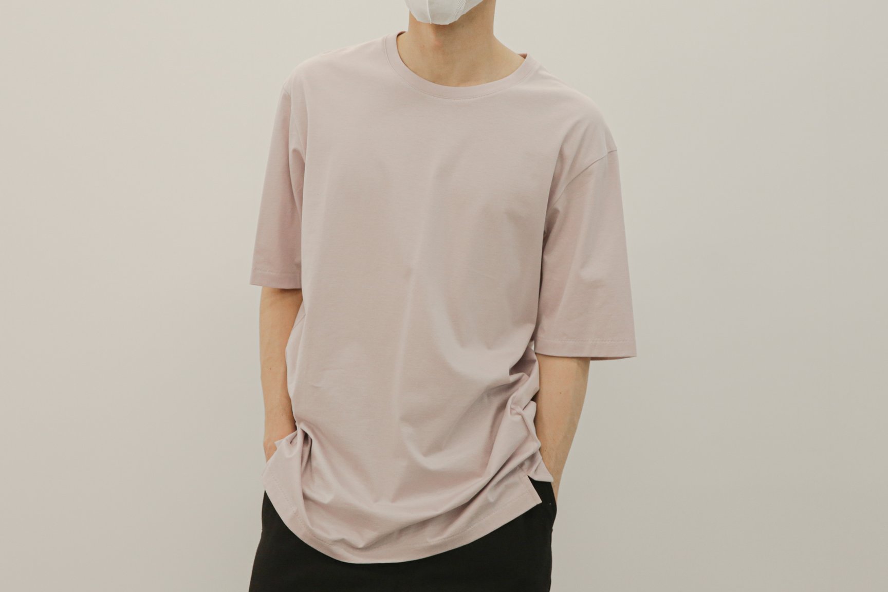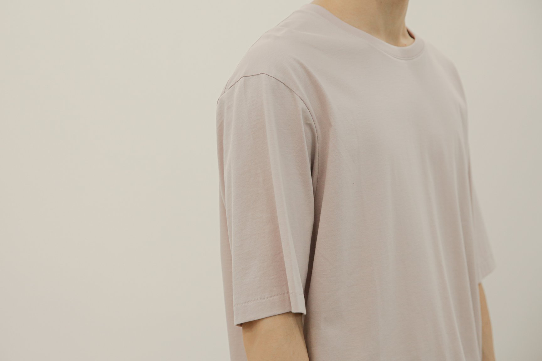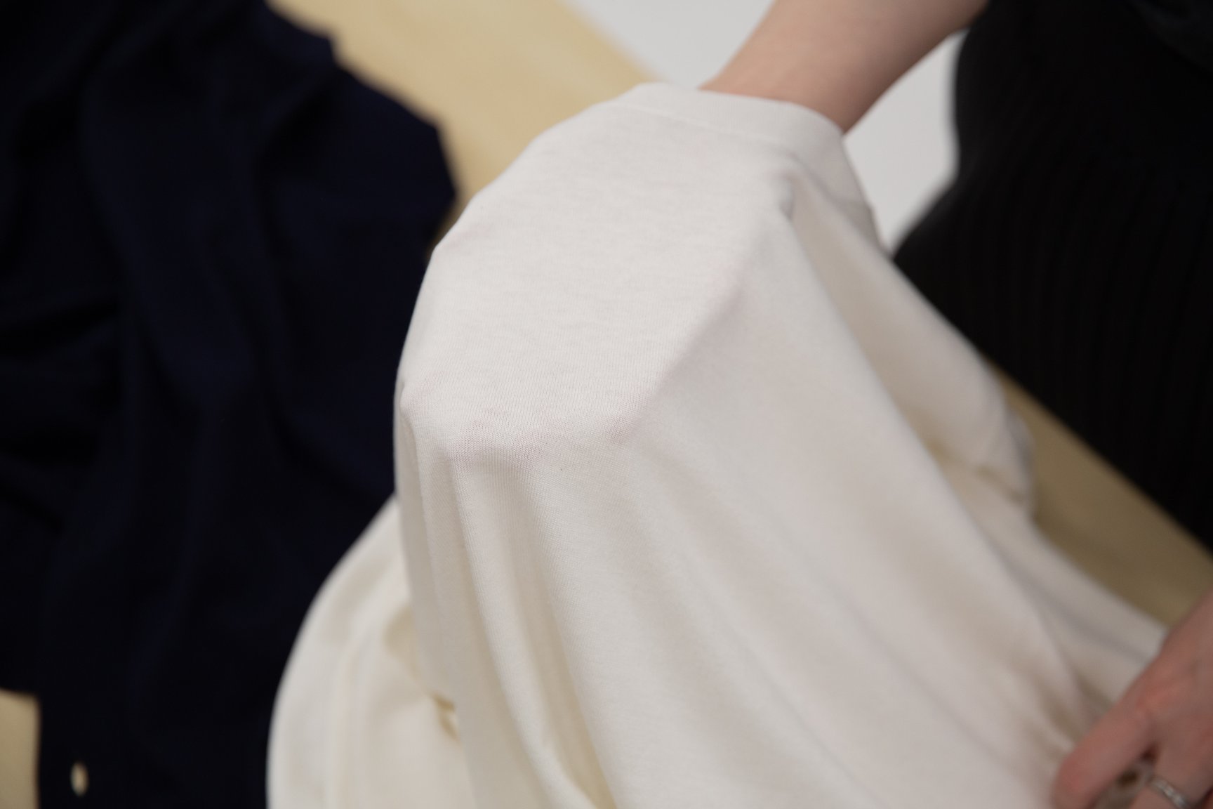 編集B:Tシャツはスーピマコットンを使用。Tシャツのパターンも前身頃と後ろ身頃で大きさが違いますね。大きめのシルエットで作られていますが、実際着てみるとあまり大きさを感じさせないですね。