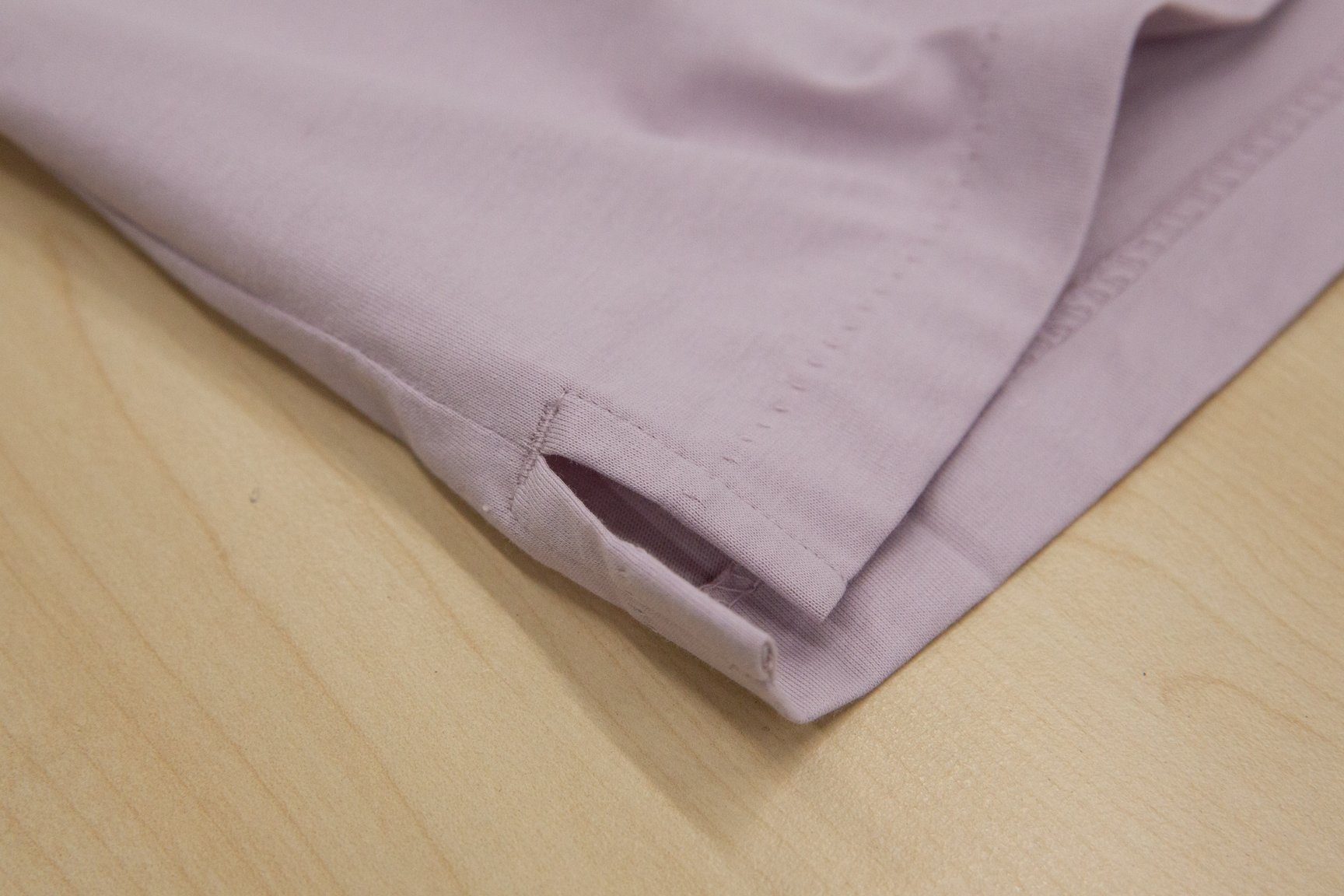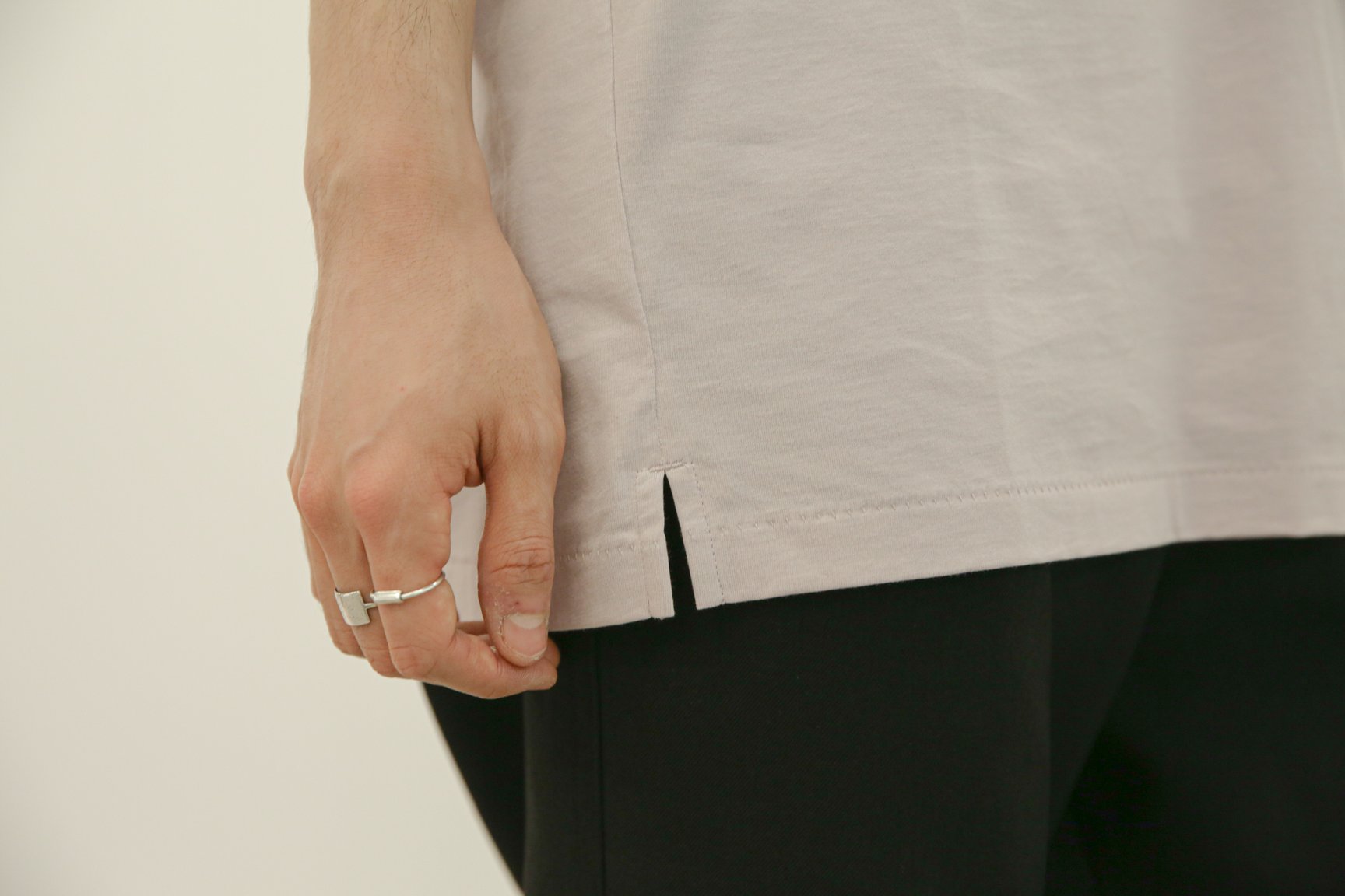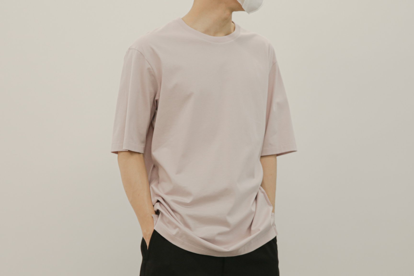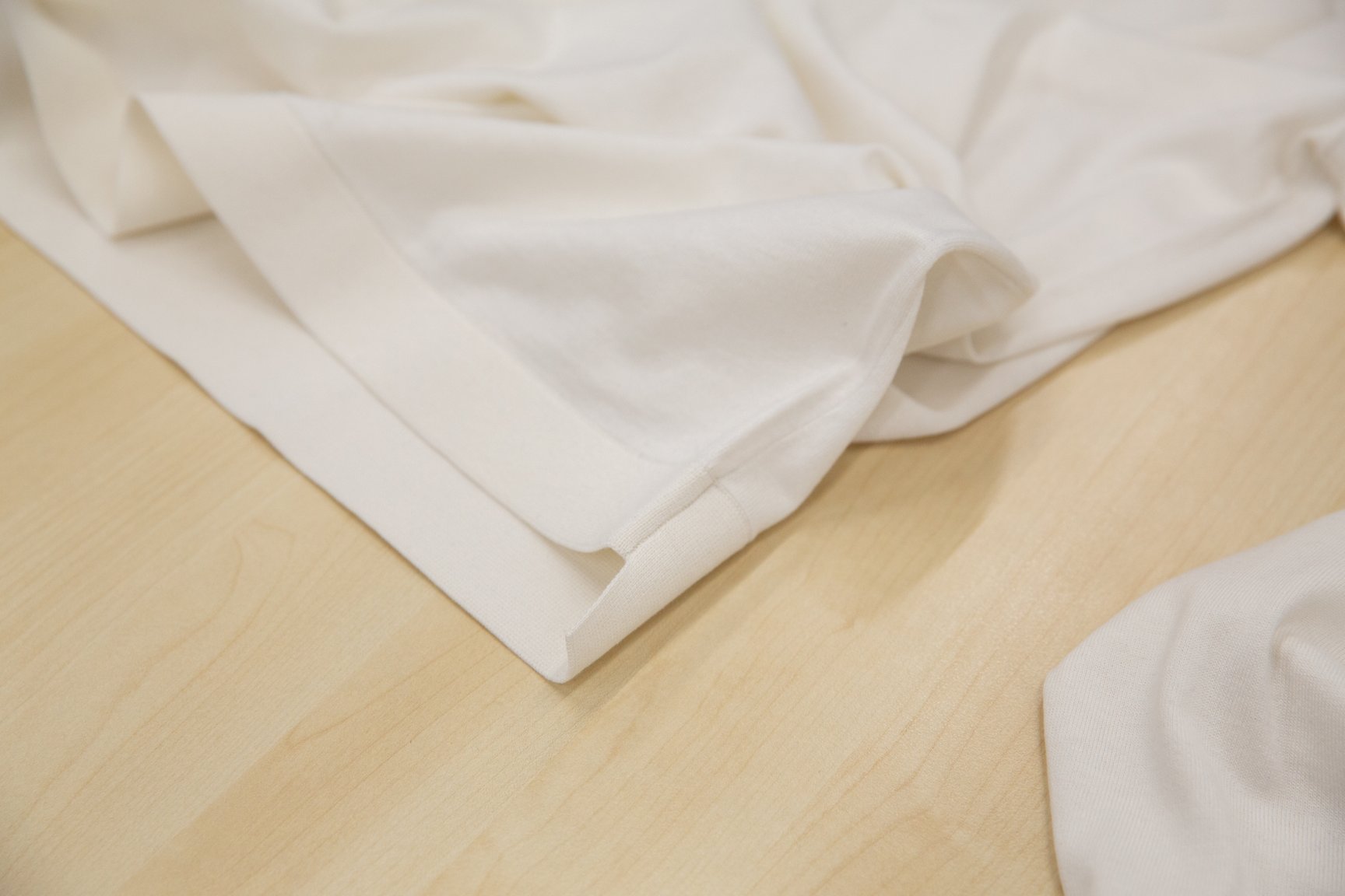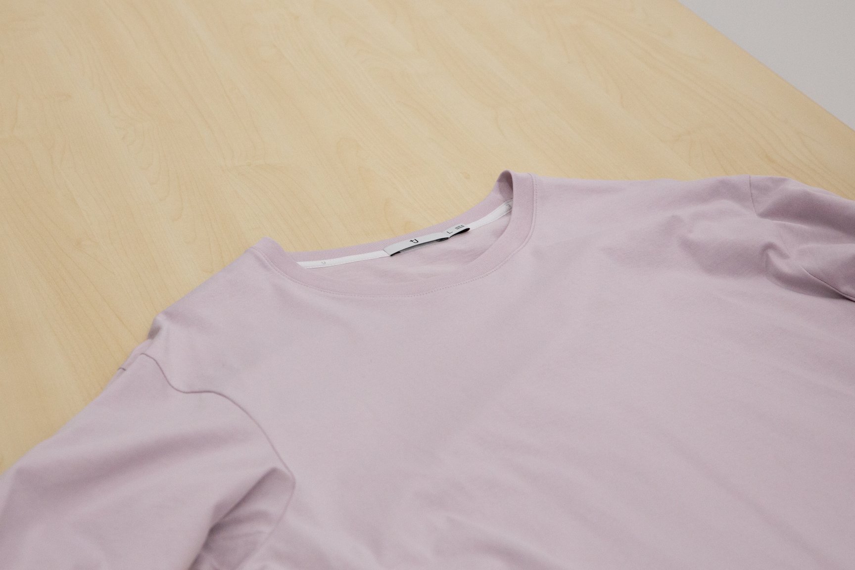 編集B:Tシャツはスーピマコットンを使用。Tシャツのパターンも前身頃と後ろ身頃で大きさが違いますね。大きめのシルエットで作られていますが、実際着てみるとあまり大きさを感じさせないですね。