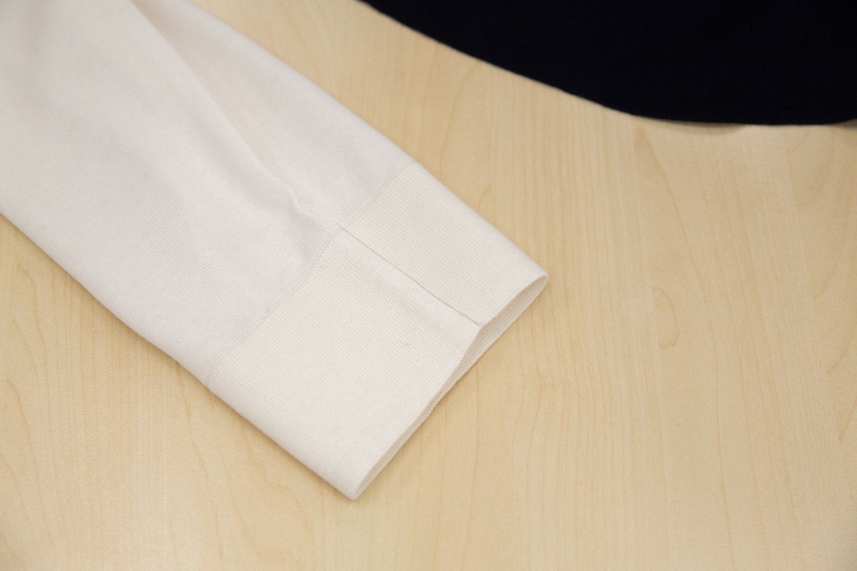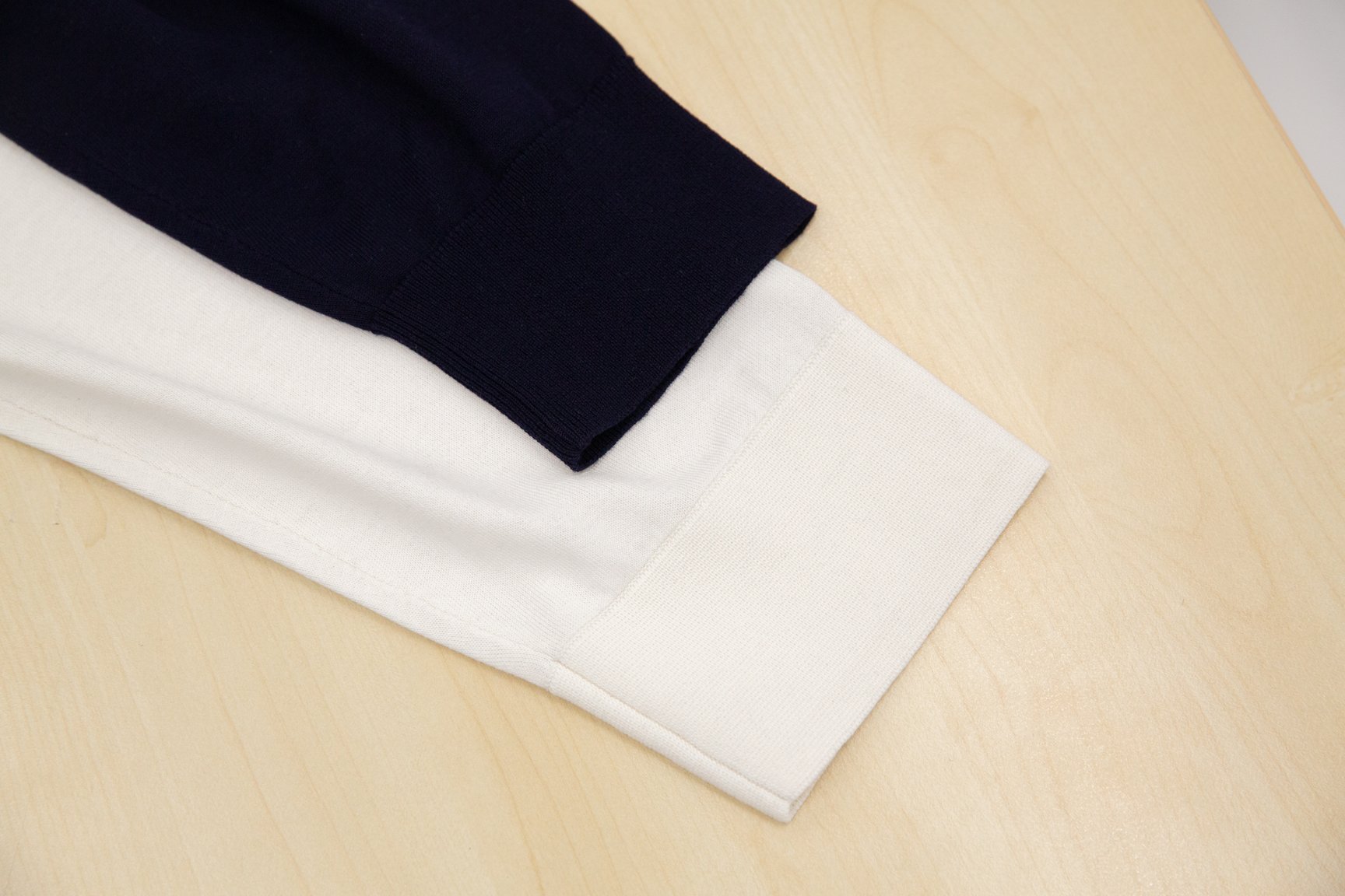 編集A:カーディガンのリブは普通だけど、クルーネックの方はリブの部分が少し変わってますね。いわゆるテレコじゃない。スパンテレコとも違うような。普通のリブは縦にラインが入るじゃないですか。これは横に線が入ってる。