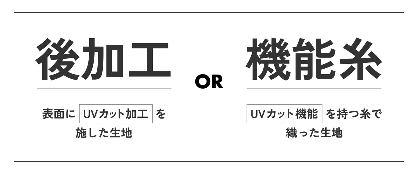 「UVカット生地」の加工は、「表面にUVカット加工を施したもの(以下、後加工)」と「UVカット効果のある繊維を織り込んだもの(以下、機能糸)」の2種類に大別されます。