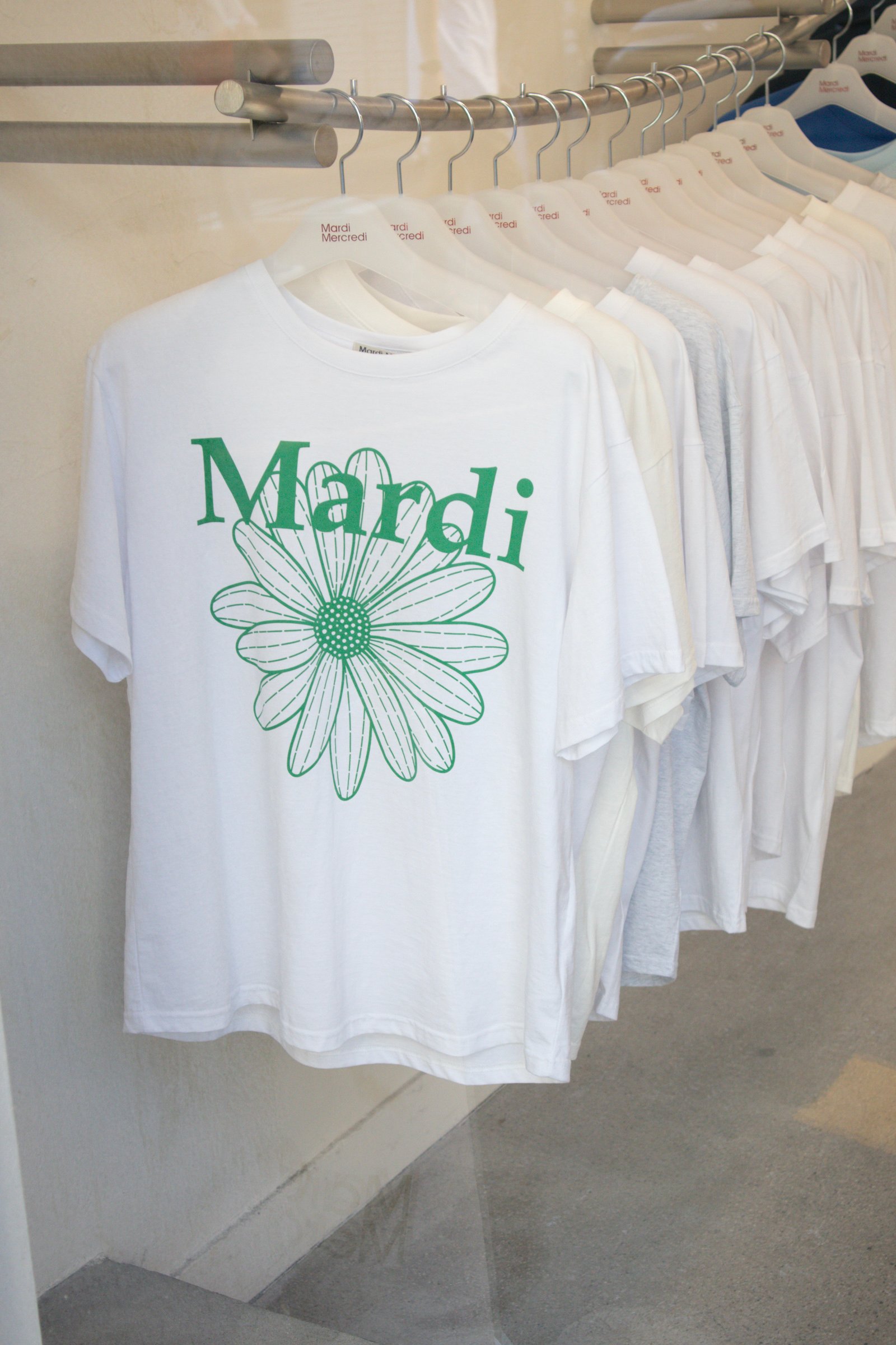 今回ブース出店はなかったものの、日本でも昨年公式オンラインストアを開設した「マルディ メクルディ(Mardi Mercredi)」もMUSINSAで展開する人気ブランド。フランス語の火曜日(マルディ)と水曜日(メクルディ)を繋げたブランド名で、デイジーの花のモチーフにMardiと大きくプリントしたTシャツは大ヒットし、SNSでも話題に。梨泰院に隣接するおしゃれスポット漢南洞(ハンナムドン)の直営店には、ロゴアイテムはもちろん、最新のコレクションや小物も充実しています。