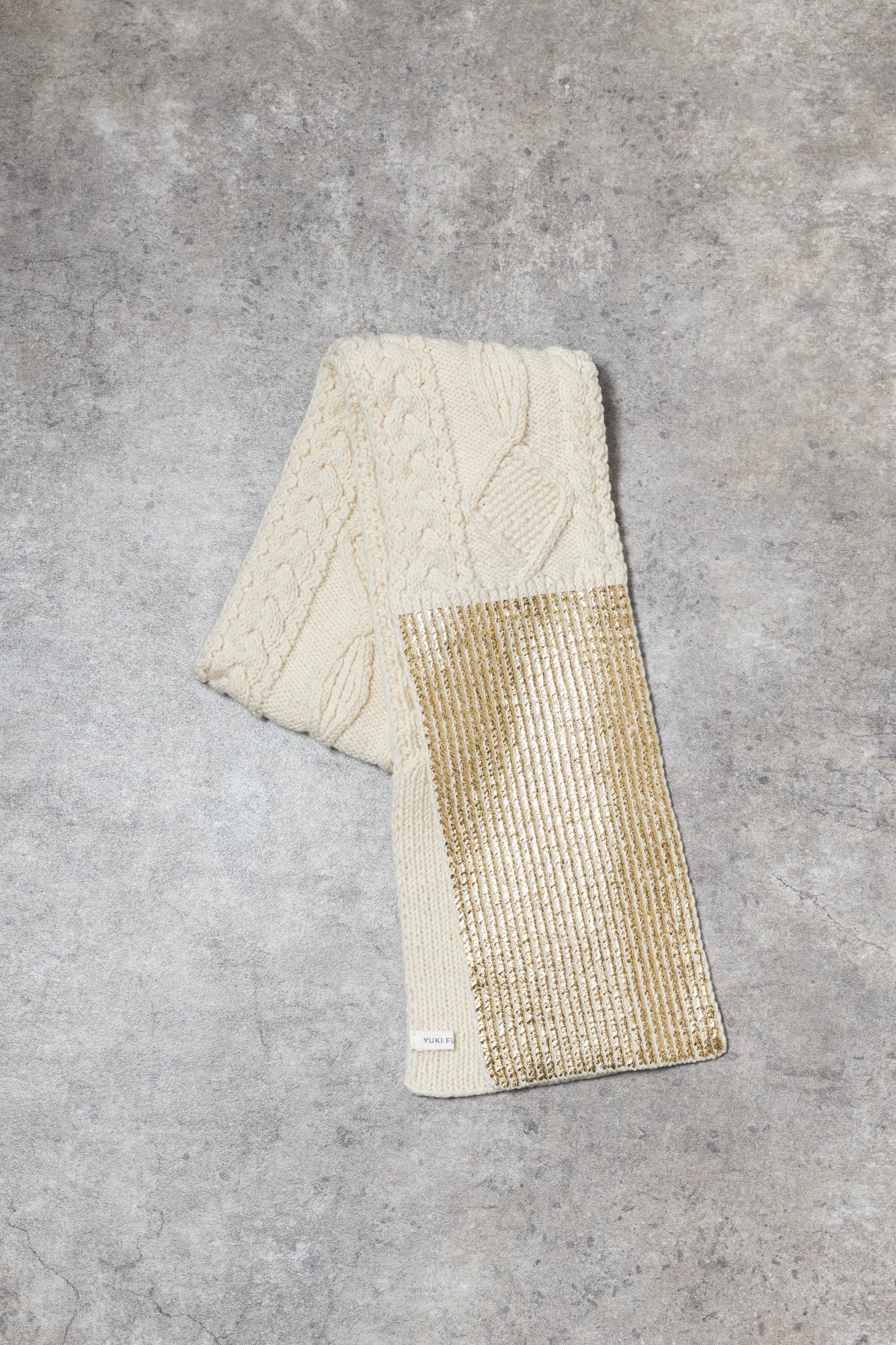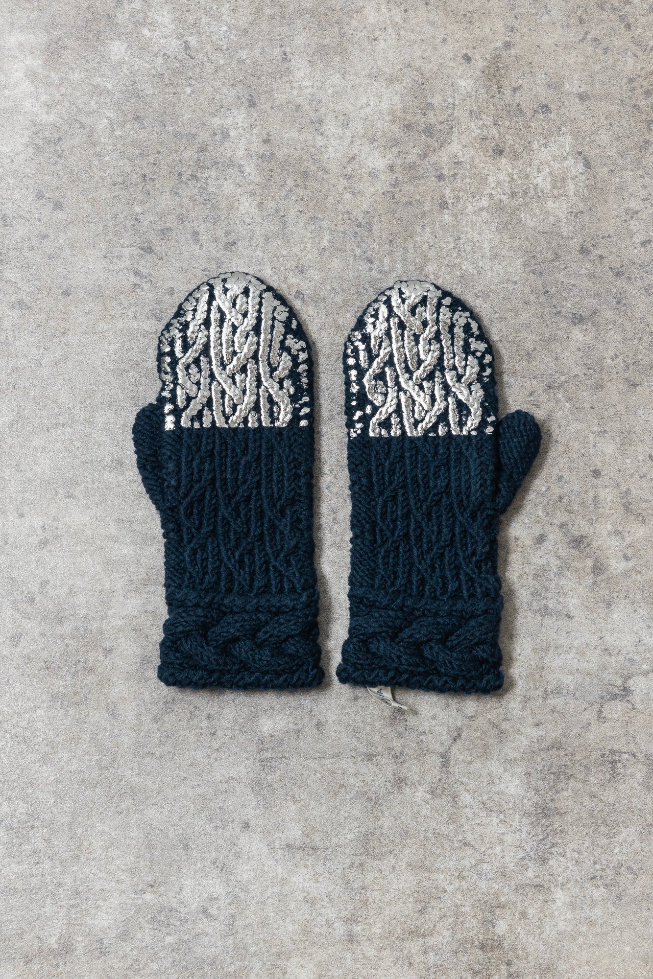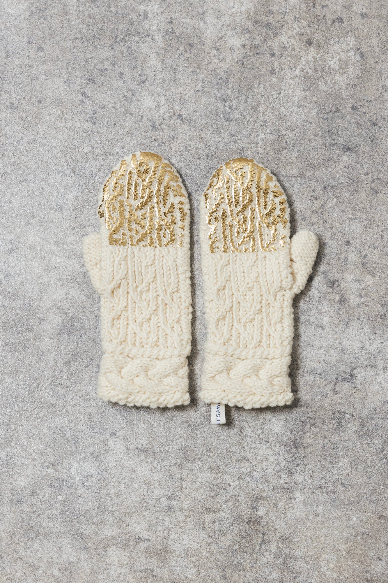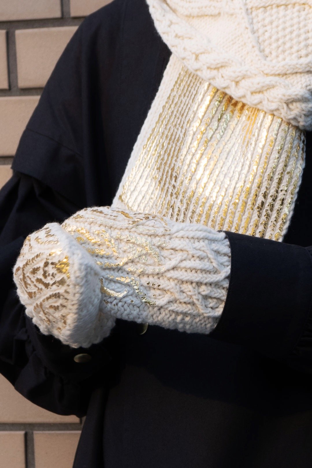 「ユキ フジサワ」からはアラン編みのニットに箔を施した冬小物が登場。ミトンの指先にはキラキラとした箔があしらわれています。また、親指と人差し指の箇所には小さな穴が空いているため、スマホの操作も楽々。見ているだけで気分が上がりそうなデザイン性と実用性を兼ね備えた名品です。