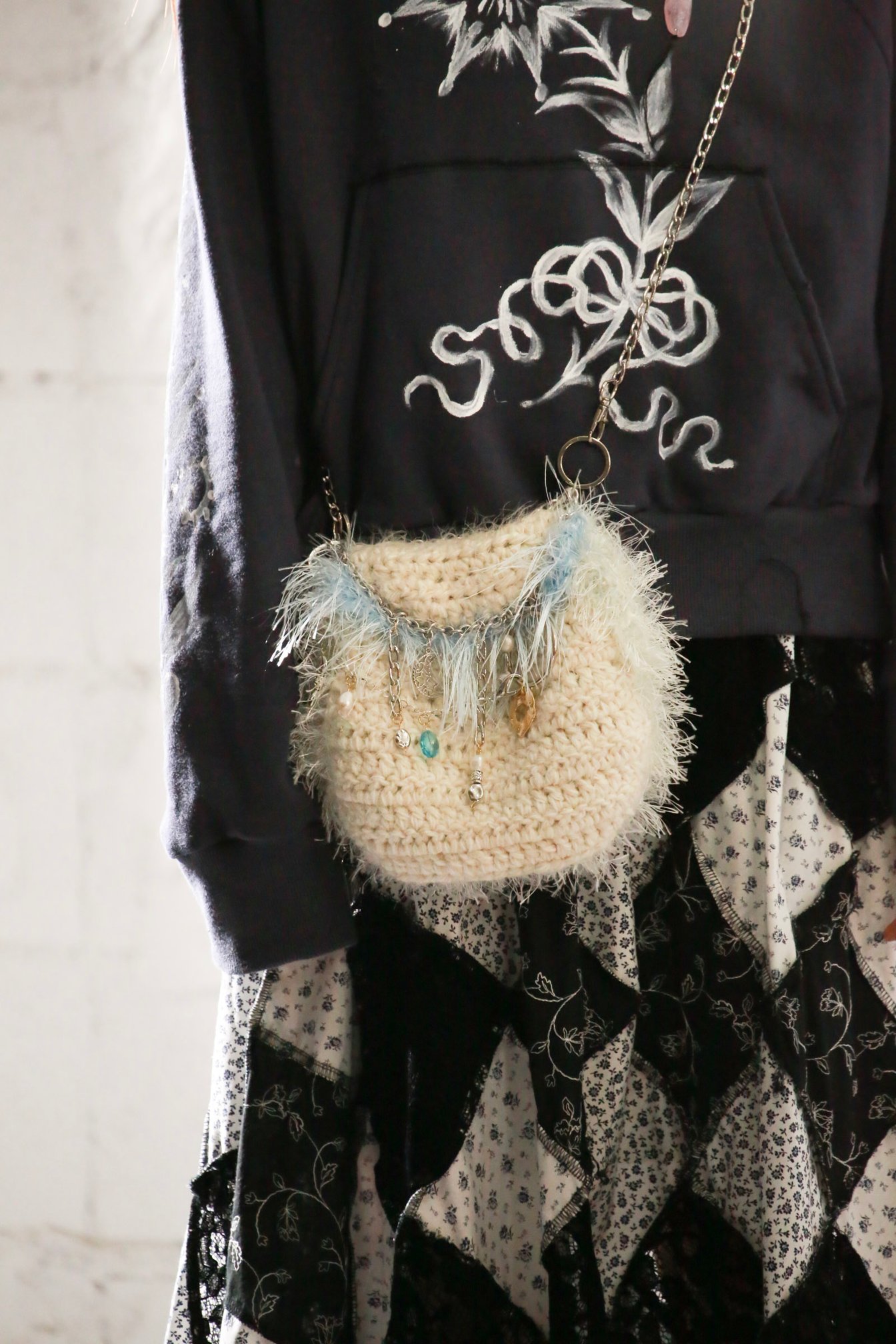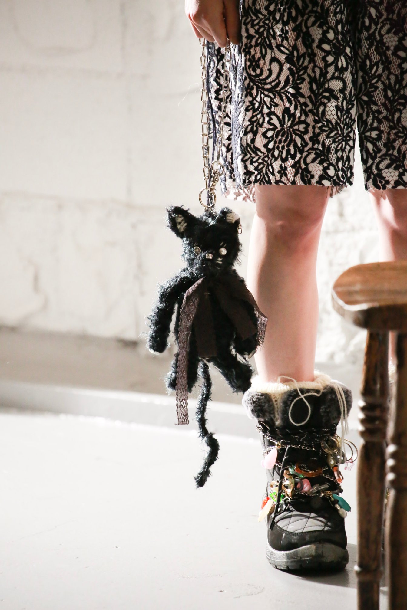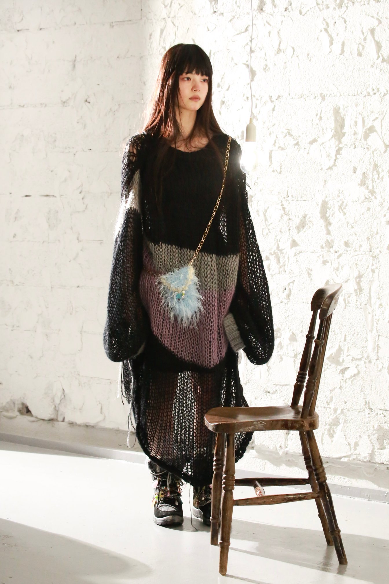しゃらしゃらと音を立てて揺れるカラフルなモチーフが繋がれたチャームは、ベルリンを拠点に活動するアーティスト、アリシア・クワデ(Alicja Kwade)の、石を反転・リピートさせて変化していく作品から着想したもの。今回のコレクションを象徴するこのモチーフは、シューレースやネックレス、バッグ、ソックスなどコレクション全体を通して様々なアイテムに用いられ、観客の記憶に積層させていった。