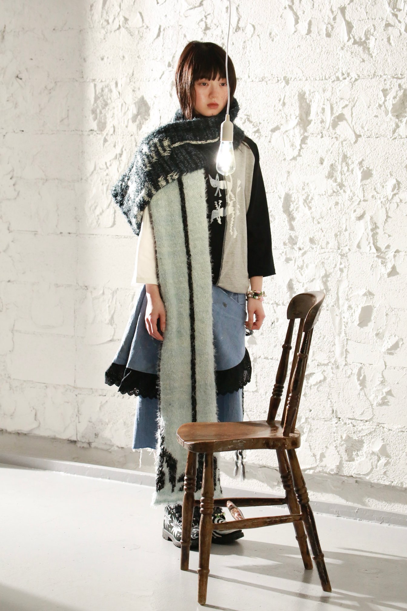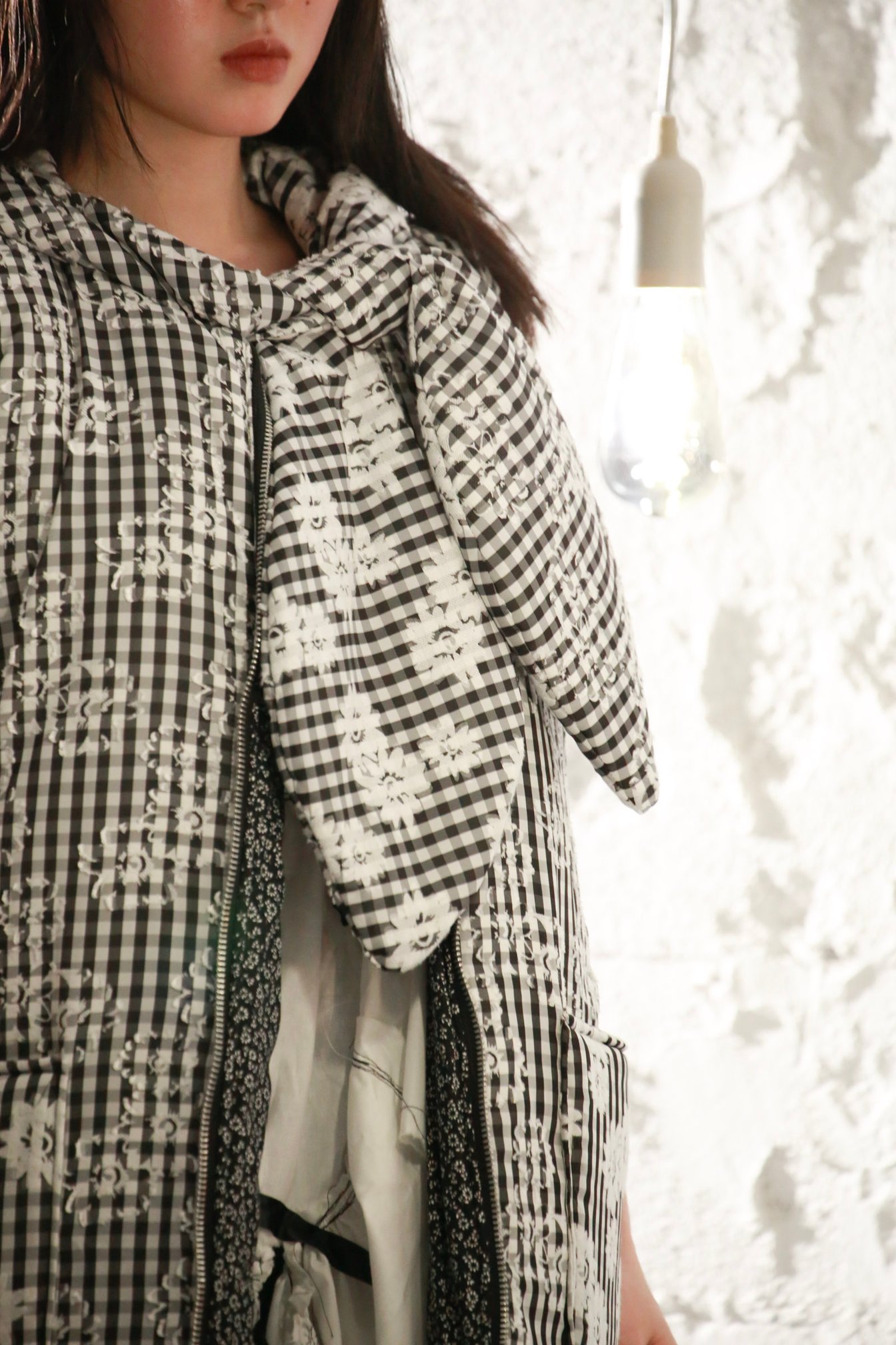 今回のコレクション制作は、映画「人生はビギナーズ」の冒頭で、主人公の父親が主人公に話しかけるシーンを服や話し方だけを変えて何度も繰り返す映像から、人間の断片的な記憶が日々積層し曖昧に塗り変わり続けていく様子に儚さと美しさを感じたところからスタート。小林の記憶の中に存在する、ロンドンや東京の友人たちが着ていた服を思い出し、混ぜ合わせながら構想したという。ユウショウコバヤシらしいクラフト感は残しつつ、「着やすい服」を作ることにフォーカスしたという今回は、色彩だけでなくシルエットも以前より「洋服らしく」仕上がっている。「今までが映画だったとしたら今回は小説的なアプローチで、日常の中のリアリティのあるストーリーを作りたかった」と小林は語る。生地の表と裏を組み合わせることで「影」が表現されたダウンベストは、ひとつのアイテムの中にもレイヤードを感じさせ、記憶が曖昧に積み重なるという今回のコレクションを象徴するアイテムだ。
