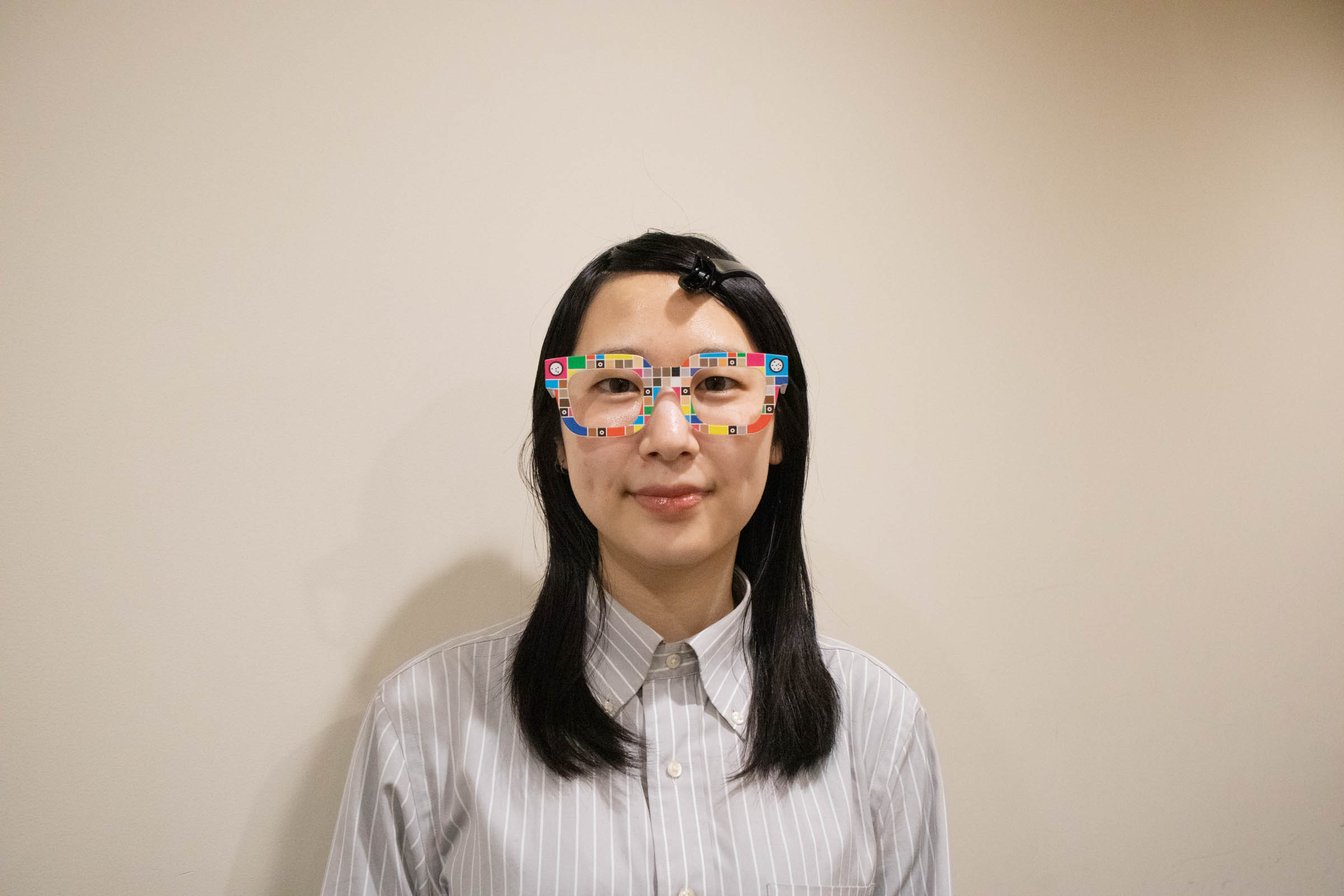 実際に付けてみるとかなりポップな雰囲気に。肌の色を正確に計測するため、基本的にはノーメイクでの着用を推奨。今回はアイブロウ以外は全てメイクオフしました。額をしっかりと出すようにしましょう。