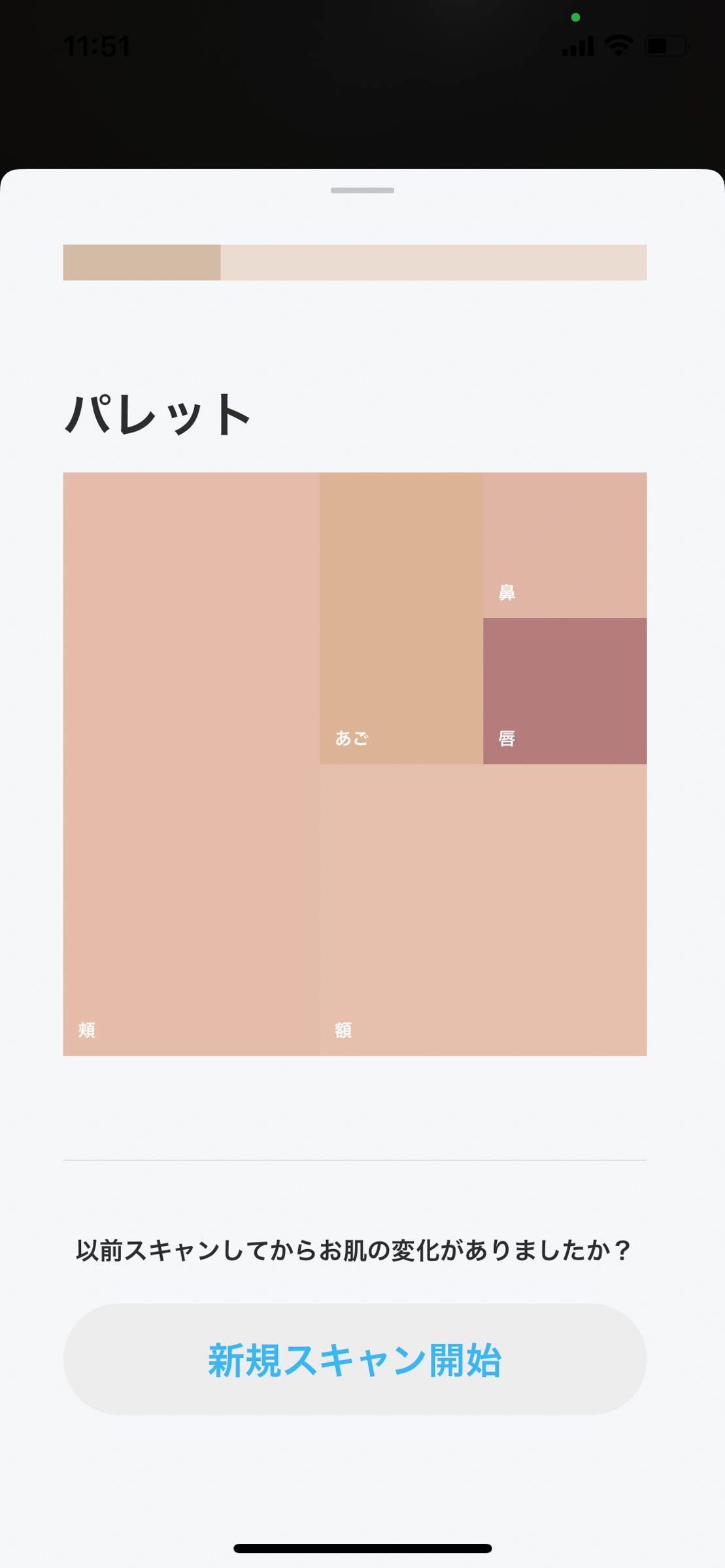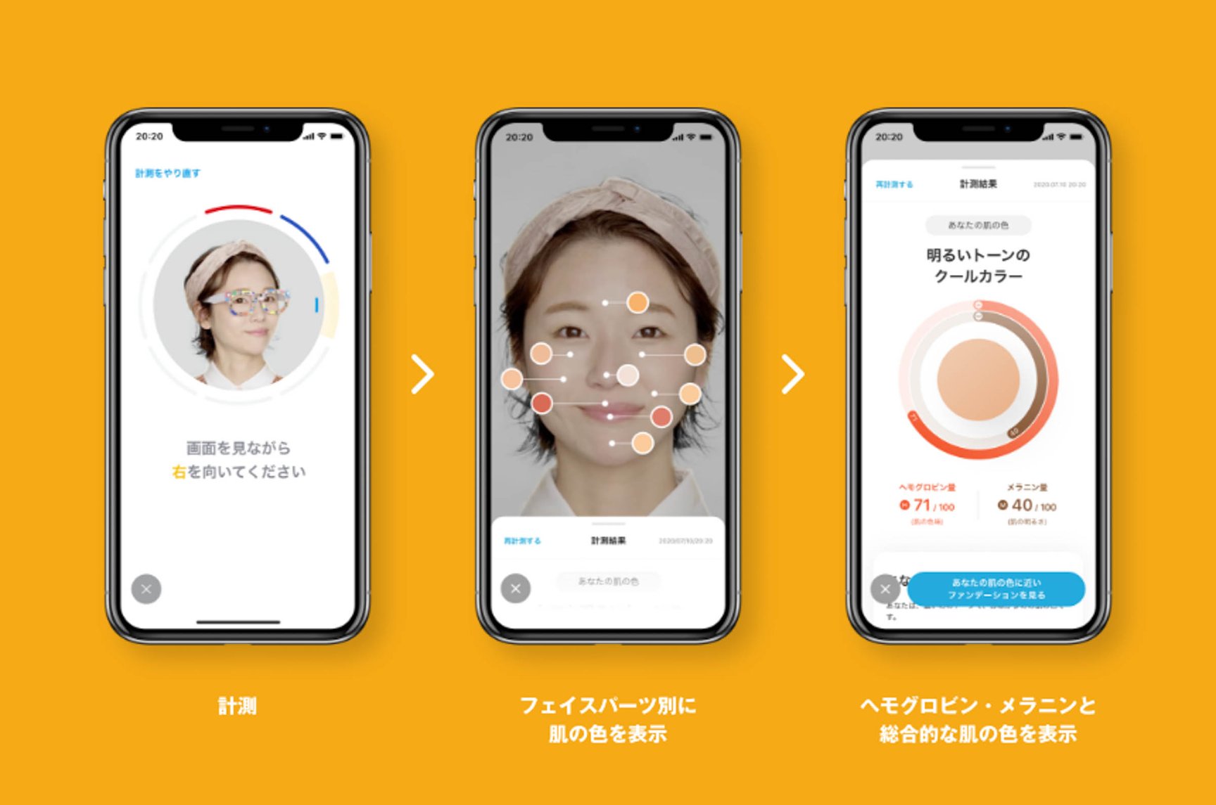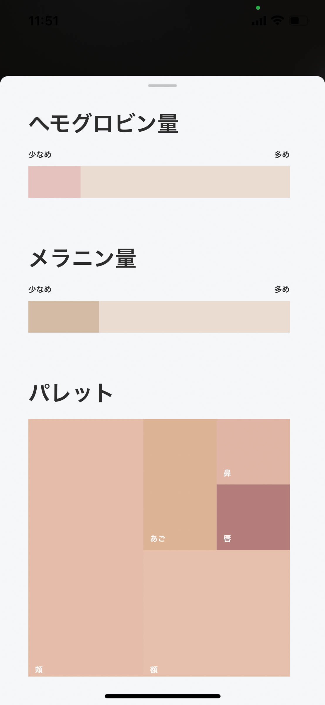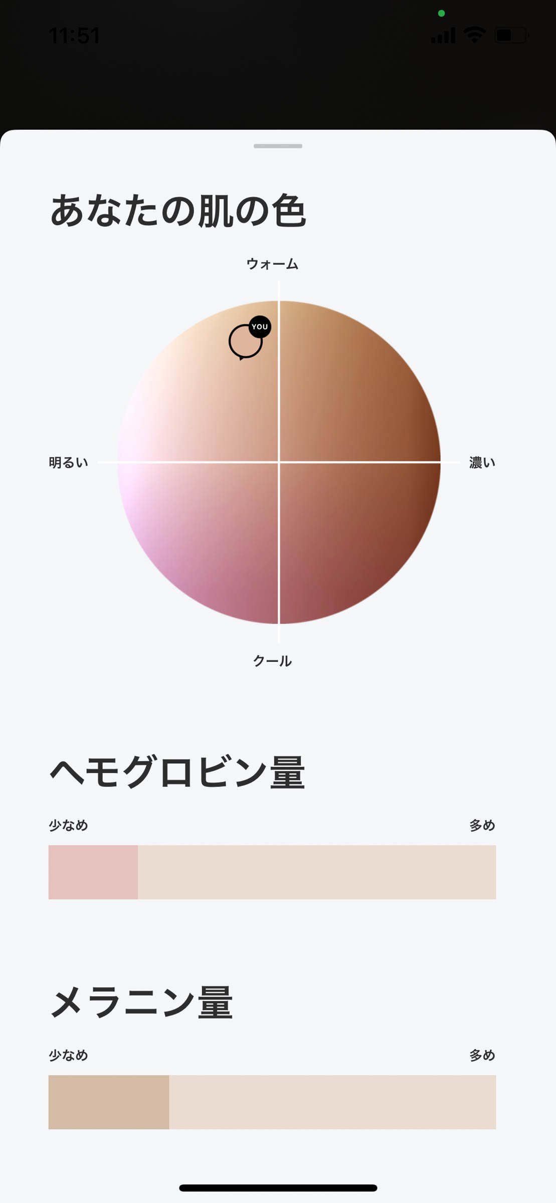 今回体験したのはデモ版ですが、肌の色をウォーム/クール、明るい/濃いの2軸のグラフ上で表示するフェイスカラーをはじめ、ヘモグロビンとメラニンの相対値、頬・顎・鼻・唇・額のパーツごとのカラーが計測されました。ローンチ時にはブルーベースやイエローベースといったパーソナルカラーも表示される予定です。