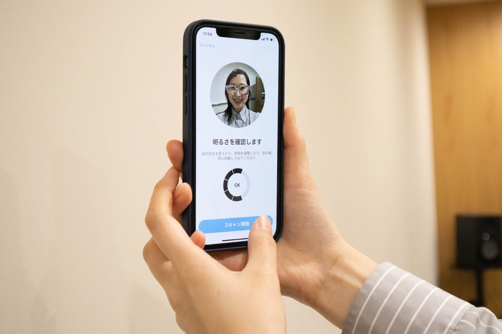 計測開始。ガイダンスに従い、顔をぐるりと回して上下左右と斜めの8方向から顔を撮影して計測します。自撮りに慣れていない人は、画面の表示に合わせて顔の位置を調整することに苦戦するかもしれません。広報担当者によると「顎の向きを上下左右斜めに向けるイメージ」でやるとスムーズにできるようです。