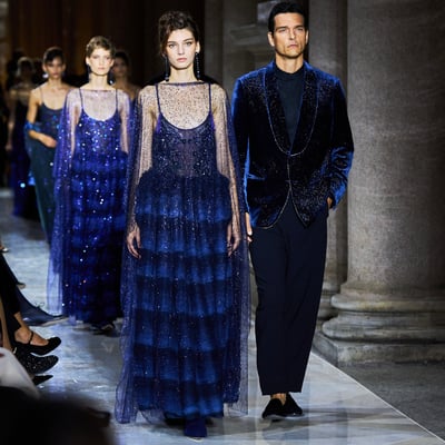 伸びやかな仕立てのラインと、空気のように儚い繊細なドレスの数々は、軽やかさの中に力強さを宿すという、アルマーニ特有の逆説的美学を体現。フィナーレでは、アルマーニのエレガンスを長年体現してきた伝説的モデルたちが再び集結した。