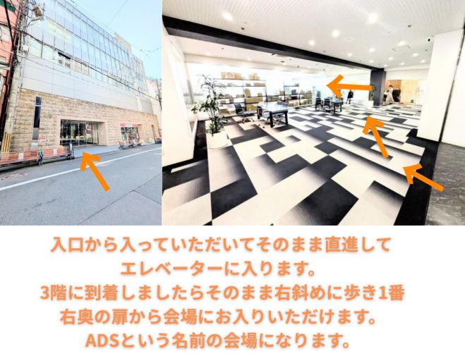 3階一番右奥の、株式会社ADSという扉を開いて中に入って左手前奥でカフェ会を開催しておりますので扉を開けてお入りください。
