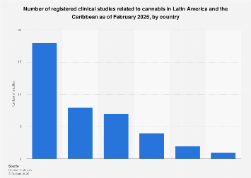 As of 2025, the number of registered clinical studies related to cannabis in Latin America amounted to 40 trials. By country, Brazil topped the list, recording 18 clinical studies involving cannabis. Mexico ranked second, with eight medical studies. Chile followed with seven registered clinical studies on cannabis in the region as of that date. In 2021, the Caribbean stood as the sub-region with the highest prevalence of cannabis use in Latin America.