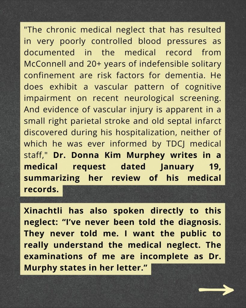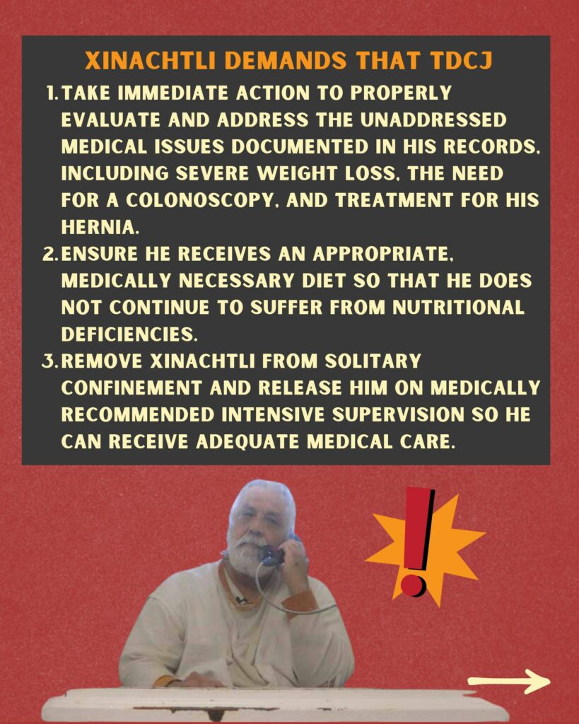 Xinachtli was NEVER informed of any of these medical issues by TDCJ medical staff. These revelations show us that it is even more critical for us to be pushing for and preparing for his immediate release.