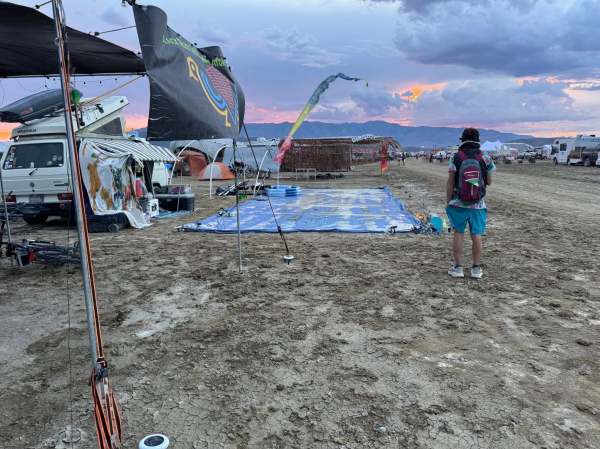 Around Black Rock City, EMT was bent, tarps trashed, yurts, bungee balls, tarps, tables– everything went flying; car windows were cracked when hit by various objects. In our camp, no one was injured by the storms, but it was very scary as we rushed to take everything down before it flew off. My pentayurt tried to escape down the street, and it was smashed trying to prevent its getaway. Saturday was traumatic, and as camp lead, I was in charge and responsible. Fortunately, almost everyone pulled together to help during the storms and with efforts to rebuild… repeatedly. Some gave up, dropped out, hid from responsibilities while others stepped up to the challenge and solved the problems at hand with creativity, resourcefulness, and positive attitudes. In our small camp of 13, we had three people who had never been to Burning Man before. What an introduction!