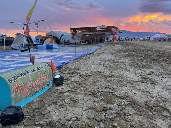 Saturday August 23’s 45 mph sustained winds with gusts ranging from 70-90mph were not fun. In fact they pretty much destroyed my freshly built camp, the Black Rock Desert Migratory Bird Refuge. And the winds wrecked a lot of other camps as well. So we rebuilt— only to have more 45-60mph winds hit on Sunday evening along with rain and more rain and more wind on Monday night. Tuesday and Wednesday evenings’ storms were mostly drizzly; the winds weren’t as bad, and thanks to the rain, they certainly weren’t as dusty as Saturday’s when you couldn’t see five feet in front of your face at times and you had to yell to be heard.
