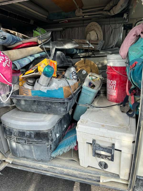 inside of the van after packing up— usually there’s room to take a nap but not in 2025 coming home