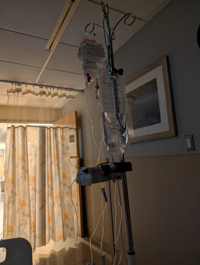 Then, out of nowhere, my recurrent atrial fibrillation emerged with tachycardia — a very rapid heart beat at 133 — and low blood pressure (90/50 vs my usual 120/70). My oxygen was consequently low. After pumping me full of more fluids, that resolved.
