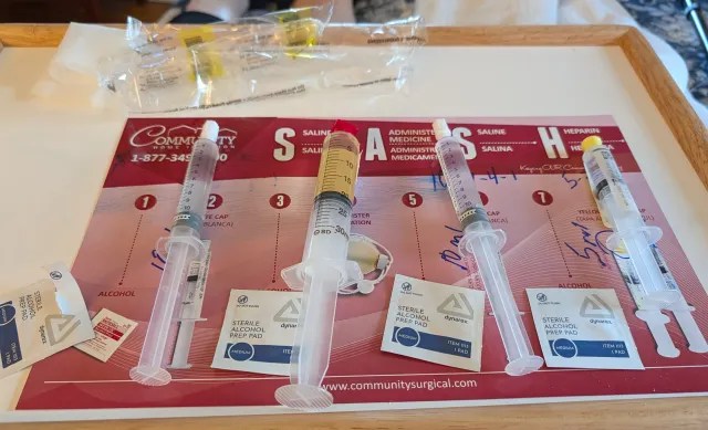 I’m trying to get back to work. The proofreading of my book is due now. I’m headquartered on a pile of pillows on the bed, forcing myself up with a cane, in a back brace. Every day, I now infuse IV antibiotics through a PICC-line, a 19-inch hose now installed from my right arm up to under my collar bone. I’ll do that for five weeks, with a kind nurse visiting to change the dressing and take blood draws once a week.