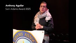 Anthony Aguilar is presented with this year’s Sam Adams Associates for Integrity Award for notifying the world of the deliberate killing of starving Gazans as they arrived for supposed U.S.-Israel food aid.