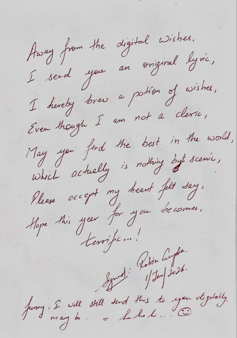 Away from the digital wishes,I send you an original lyric,I hereby brew a potion of wishes,Even though I am not a cleric,May you find the best in the world,Which actually is nothing but scenic,Please accept my heartfelt say,Hope this year…