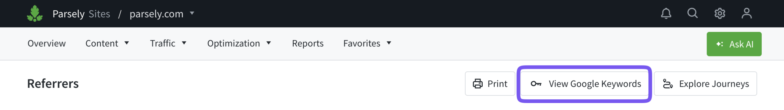 You may also access GSC data from the referrers page. Click the “View Google Keywords” button.