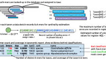 Kraken 2 classifies sequence fragments similarly to Kraken 1, with modifications to facilitate minimizer- and hash-based subsampling. For each k-mer in an input sequence, Kraken 2 finds its minimizer and, if it is distinct from the previous k-mer’s minimizer, uses it as a key to probe the CHT. If the minimizer matches a key in the CHT, Kraken 2 considers the associated LCA value to be the k-mer’s LCA (Fig. 1b). Classification then proceeds in the same manner as Kraken 1, taking note of how many k-mer hits mapped to each taxon, constructing a pruned classification tree, and using the leaf of the maximally scoring root-to-leaf path of that tree to classify the sequence [4]. If hash-based subsampling was used to build the CHT, each minimizer has its hash code compared against the table’s maximum allowable hash code, and minimizers with higher-than-allowed hash codes are not searched against the CHT. Any k-mer containing an ambiguous nucleotide code is also not searched against the CHT.