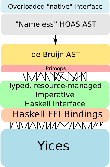 The base layers are the most straightforward part of the system. First, we write a natural FFI binding to every function exposed by the Yices C API. Each C function gets an FFI import; value types are represented by types defined in the Haskell FFI report (e.g. CInt, CString), while Yices types allocated and controlled by Yices are typed in Haskell with empty data types (e.g. YExpr), giving us increased type safety (compared to using void pointers).