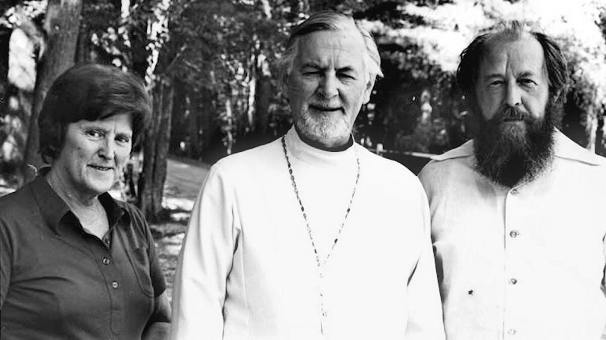 Father Alexander Schmemann (center) with his wife, Matushka Juliana (left), and Alexander Solzhenitsyn (right).