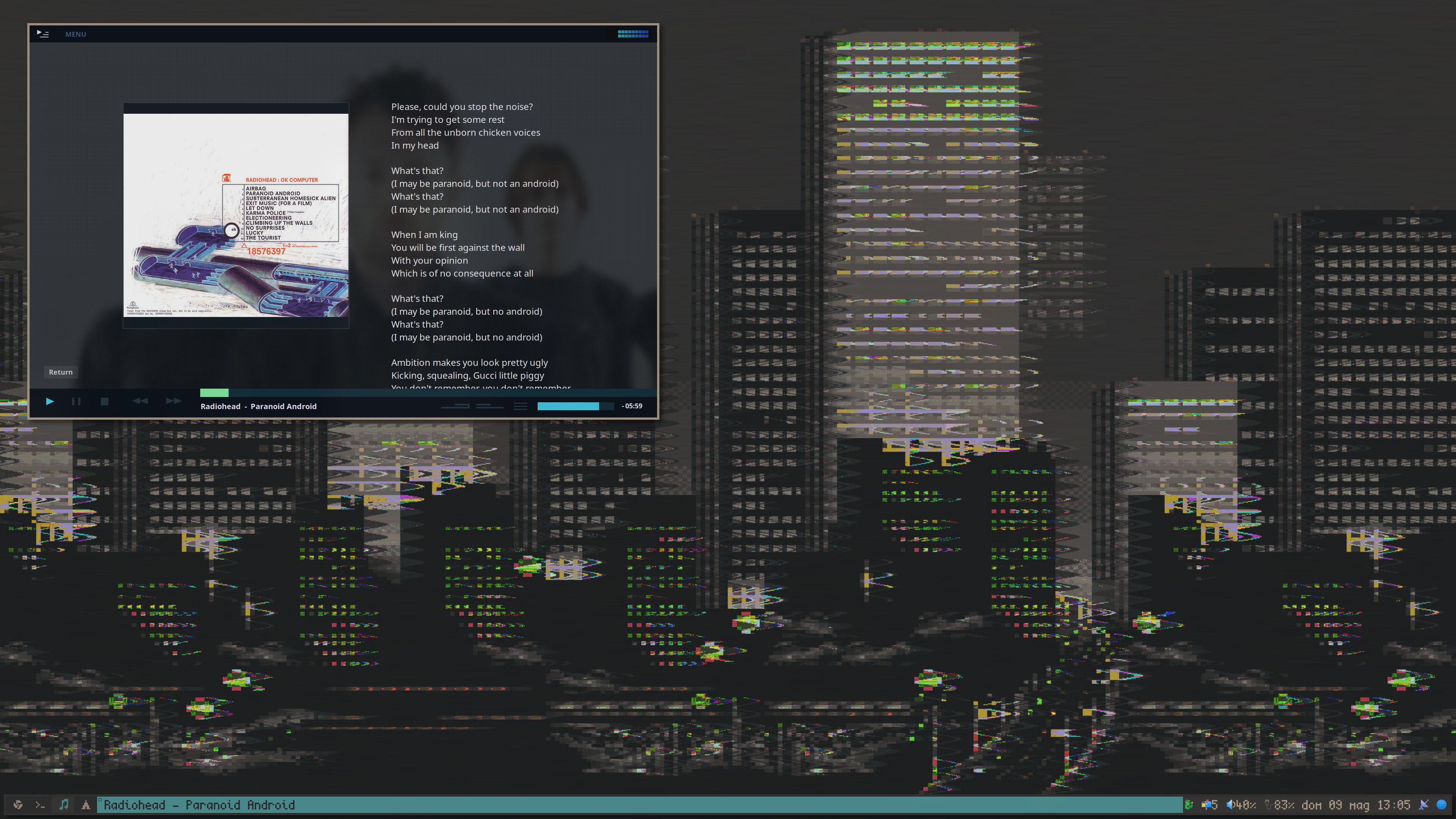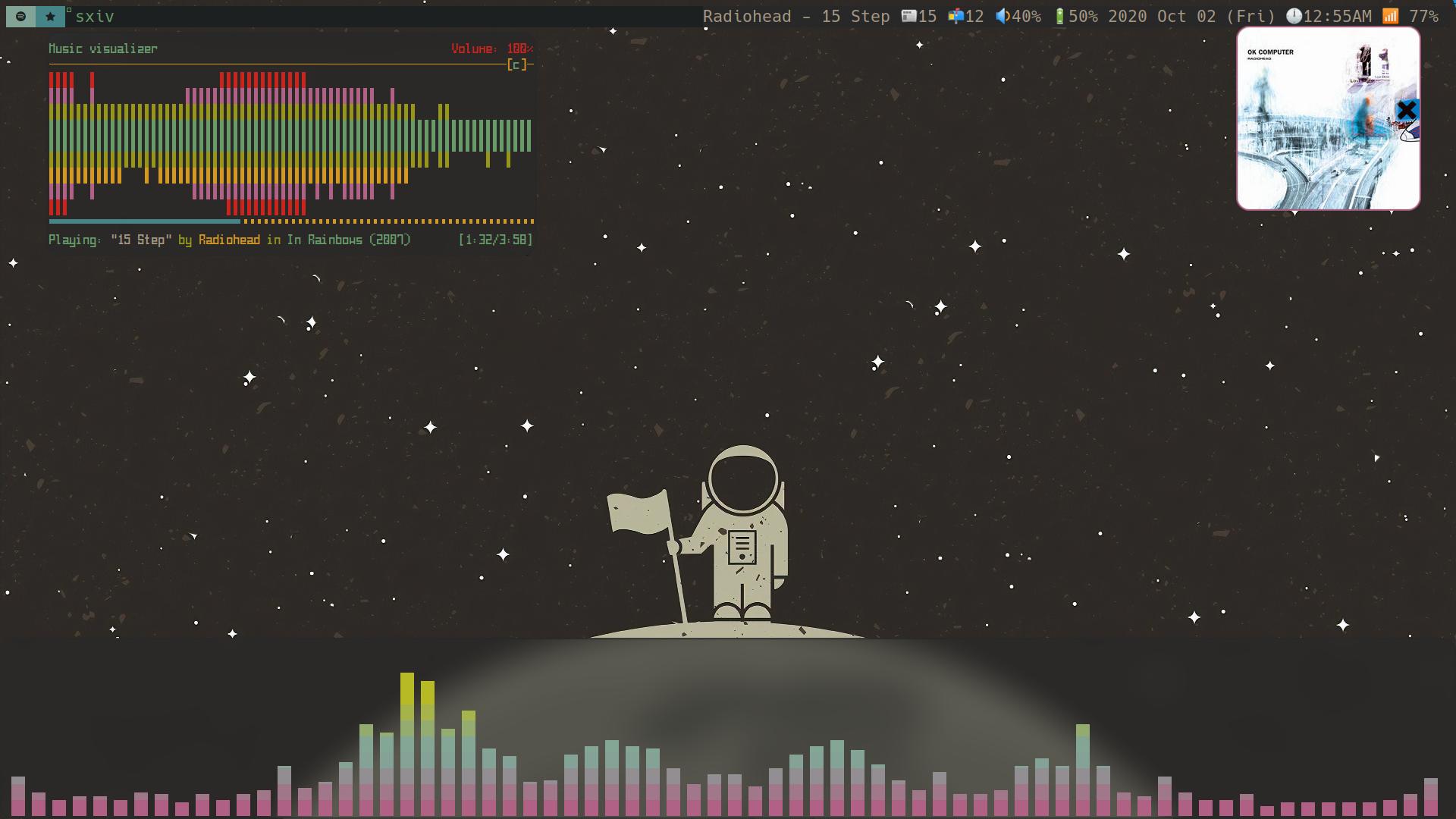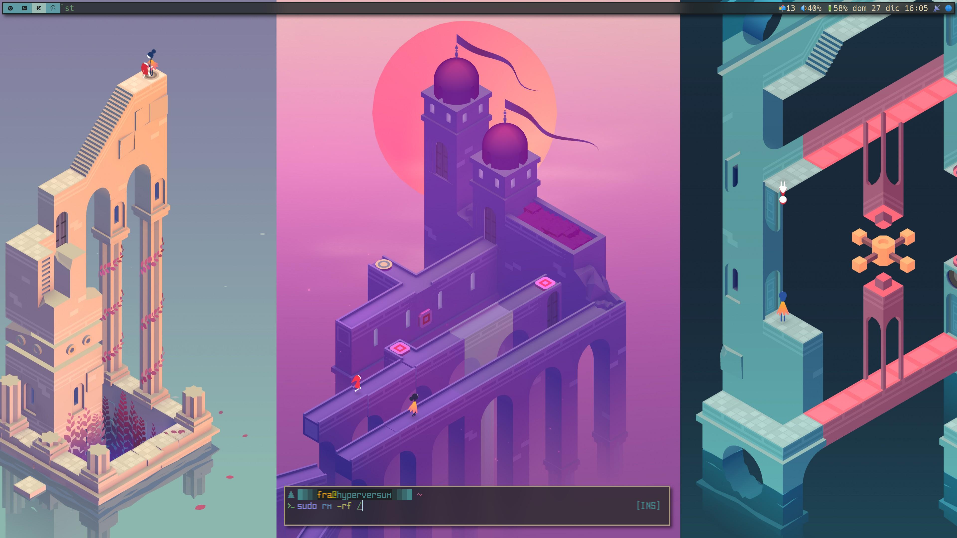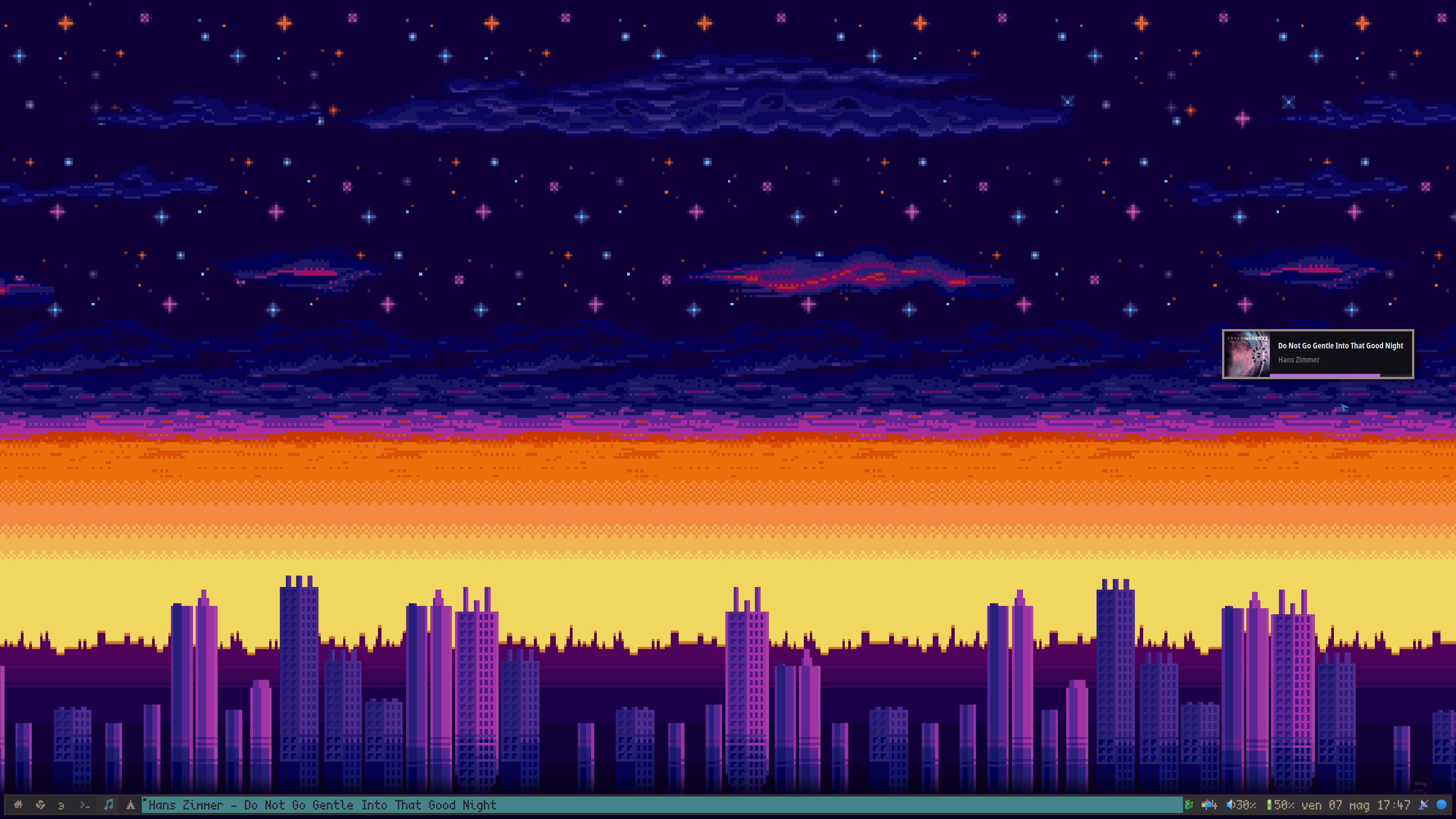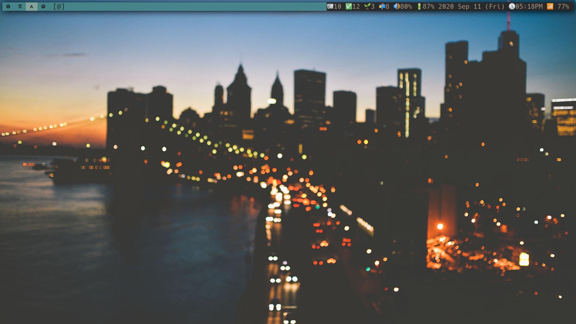 - Suckless utilities (links are to my patched repositories): dmenu, dwm (Window Manager), st (terminal emulator) and xss+slock (screensaver).