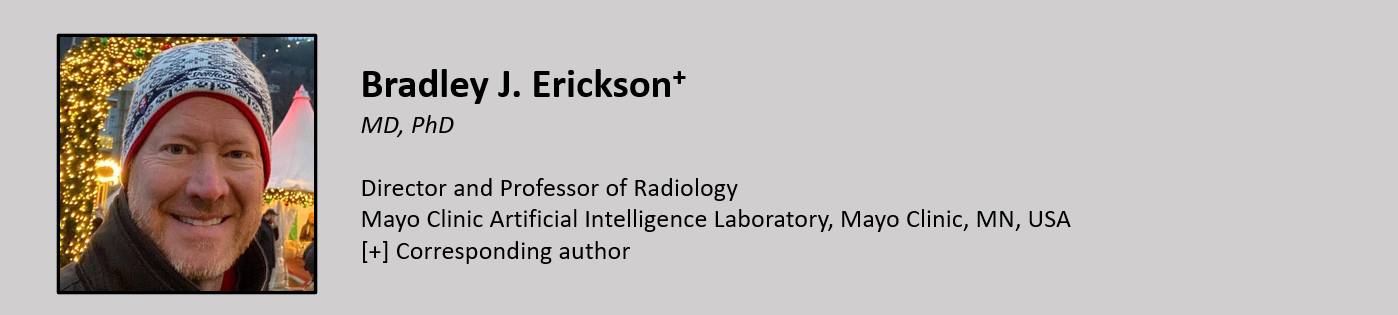 The Mayo Clinic Artificial Intelligence (AI) Laboratory, located at Rochester, Minnesota, USA, is directed by Dr. Bradley Erickson and focuses on enhancing patient care by developing and deploying advanced machine learning (ML) solutions for a number of medical specialties, including diagnostic radiology, pathology, cardiology, etc. To learn more about the Mayo Clinic AI Laboratory and read about our recent publications, please feel free to follow our Twitter account or have a look at the Massive Open Online Course (MOOC) our lab has created to explain machine learning (ML) to individuals who are eager to apply it to healthcare.