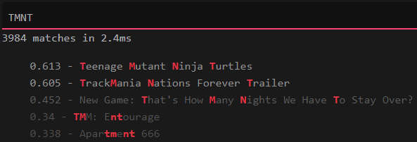fuzzysort.highlight()& Addedresult.highlight() - Changed scoring: score is now a number from 0 to 1 instead of from -Infinity to 0