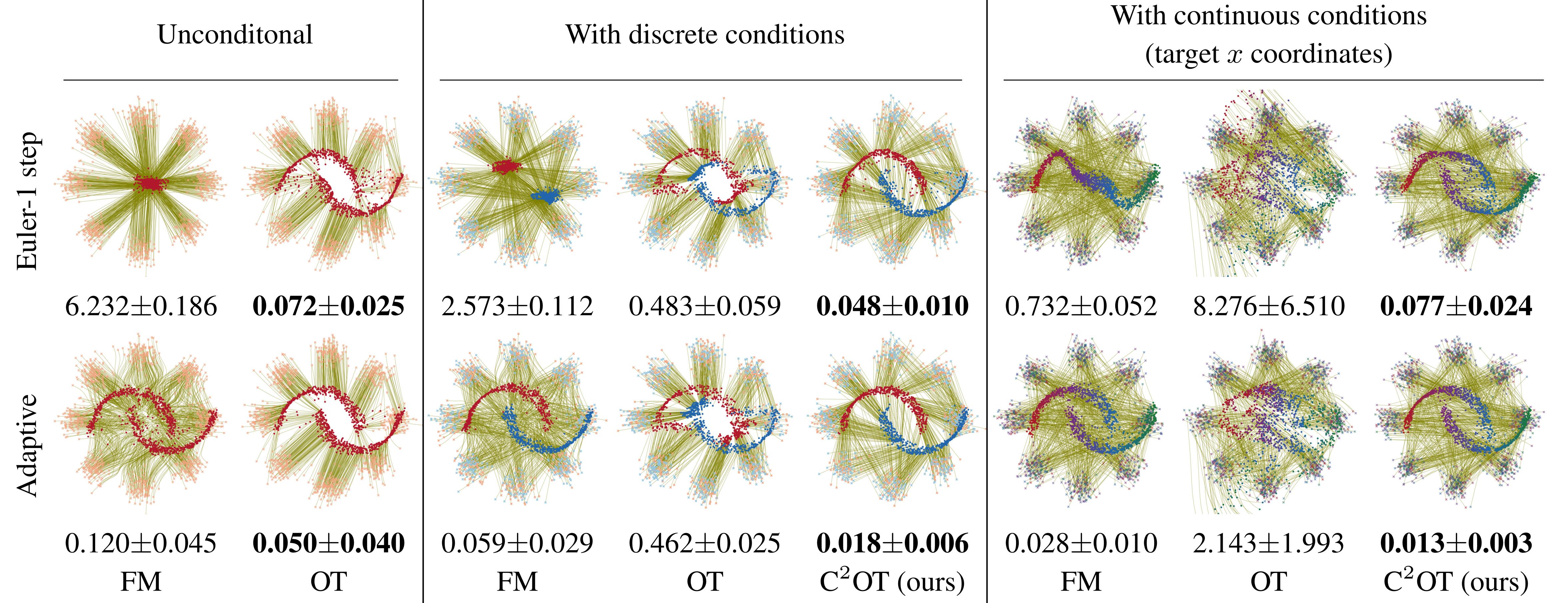 C2OT is an algorithm for computing prior-to-data couplings for flow-matching-based generative models during training. Our goal is to achieve straighter flows, enabled by optimal transport (OT) couplings, while mitigating the test-time degradation that OT encounters in the conditional setting (see figure above). The key idea is that OT samples from a condition-skewed prior distribution at test time, whereas C2OT unskews the prior by incorporating a condition-dependent term into the OT cost.