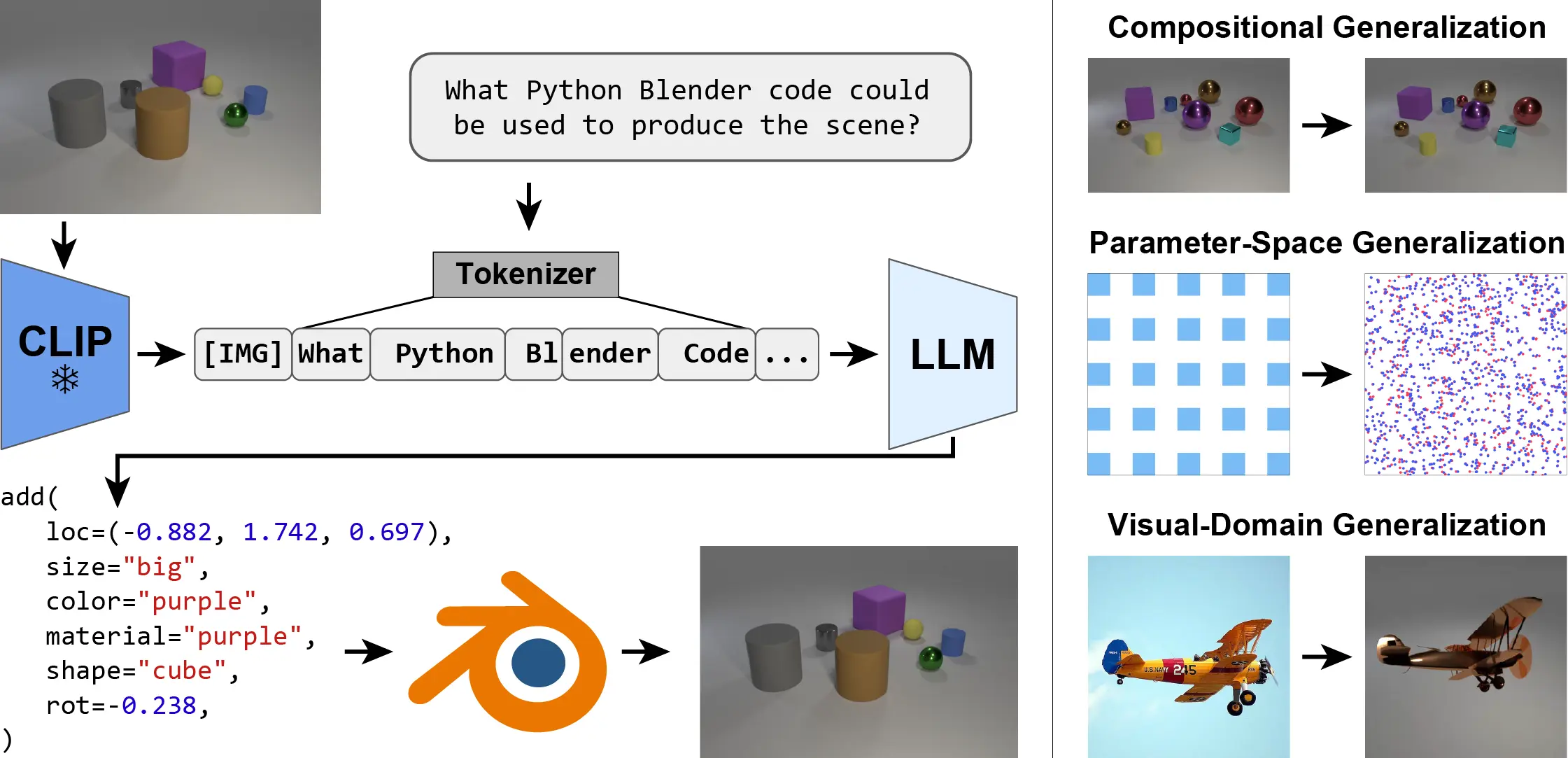 We present the Inverse-Graphics Large Language Model (IG-LLM) framework, a general approach to solving inverse-graphics problems. We instruction-tune an LLM to decode a visual (CLIP) embedding into graphics code that can be used to reproduce the observed scene using a standard graphics engine. Leveraging the broad reasoning abilities of LLMs, we demonstrate that our framework exhibits natural generalization across a variety of distribution shifts without the use of special inductive biases.Training and evaluation data can be found at https://ig-llm.is.tue.mpg.de/download.php after registering on the project page. The following is an outline of the data available: