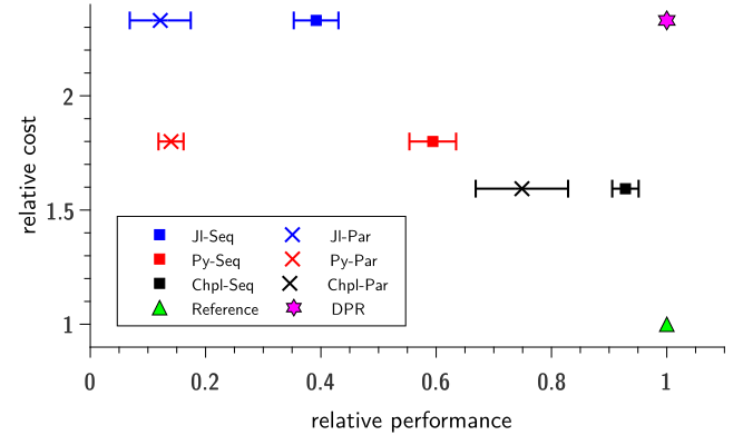 Illustration of the trade-off between relative cost and relative performance of three languages compared to the reference one. In the graph, the arrows point to the desired productivity region (DPR). The trade-off between relative cost and relative performance of Chapel, Julia, and Python compared to the reference implementation. In the graph, the desired productivity region (DPR) is on point 1.2.33. For more details, see Gmys et al. (2020).
