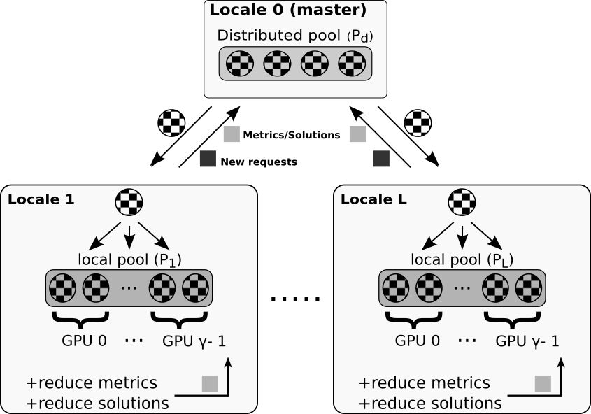 The locale 0 (master) is responsible for generating the distribute pool Pd and controlling the search. Each worker locale receives nodes from the master and generates a local pool that is partitioned into CPU and GPU portions. L locales are launched on L-1 computer nodes.