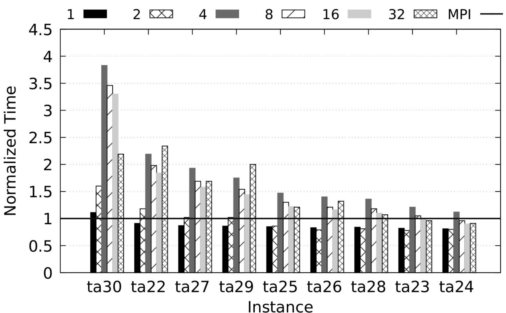 Execution times of Chapel-BB solving to the optimality Taillard instances ta21-30. The execution time is given relative to the MPI-PBB baseline. Next, normalized the productivity achieved by Chapel compared to its counterpart written in MPI+Cpp. Experiments executed on 1 (32 cores) to 32 nodes (1024 cores). For more details, see Carneiro et al. (2020).