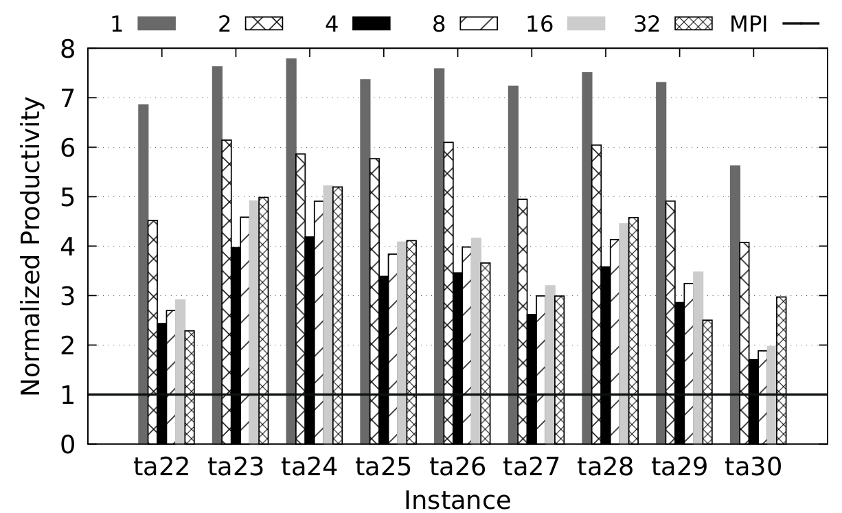 Some productivity/performance results of using Chapel for distributed exact optimization vs MPI+Cpp, flow-shop scheduling problem: