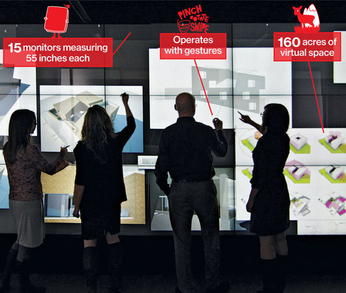 Apple (AAPL) has rolled out smaller models of its iPad. Jeff Reuschel is thinking bigger. The global design director for office-furniture maker Haworth, in partnership with interactive display company Obscura Digital, has created a touchscreen that covers a conference-room wall. Like a supersize version of CNN’s (TWX) Magic Wall, Bluescape displays a unified image across 15 linked 55-inch flat-screen monitors, each equipped with 32 specialized sensors to read users’ hand movements. Unlike whiteboards or flip charts, it won’t require much erasing or page turning: When zoomed out as far as possible, the digital board’s virtual space totals 160 acres. Using Bluescape, corporate and university clients can store often scattershot brainstorming sessions in perpetuity. Co-workers or classmates can add digital sticky notes, either with a digital pen on the wall itself or by uploading documents from other devices, from which they can also browse the virtual space. “There are fewer and fewer people working in cubicles,” says Reuschel. “The old-fashioned vertical surfaces are going away.”