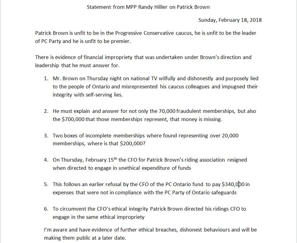Adding to the blaze, MPP Randy Hillier posted this today, accusing former leader and alleged creep Patrick Brown of financial impropriety: