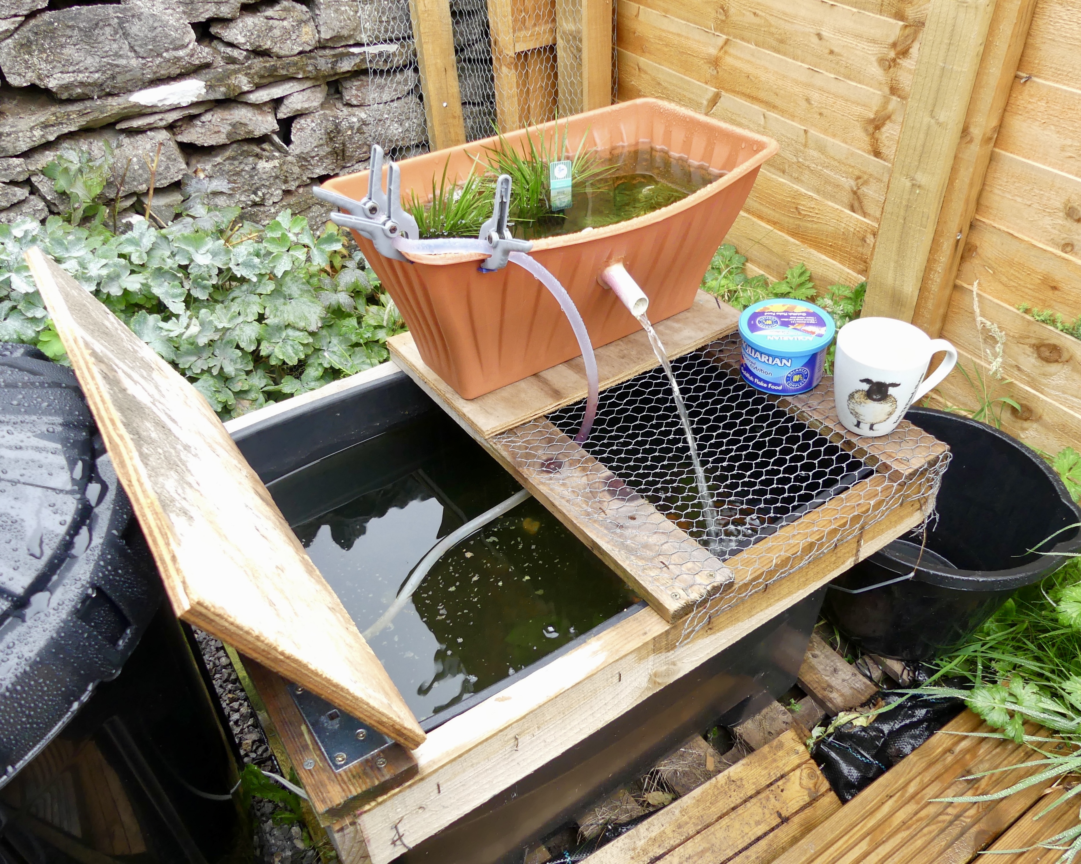 Solar powered fish tank with bio filter. I set this up so the shubunkins could go out during the summer.