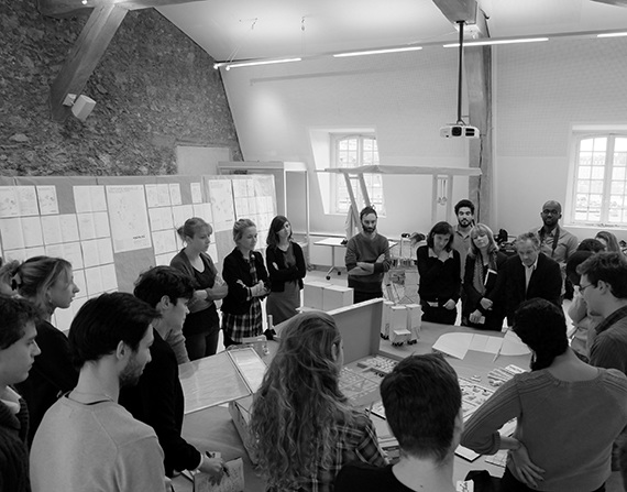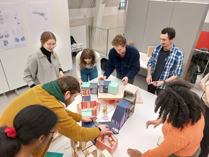 Rendu de l'atelier "Alternatives construites", atelier de projet d'architecture niveau Master, encadré par Martial Marquet et Soumaya Nader à l'ENSA VERSAILLES, à la fin du semestre les étudiants se retrouvent autour de leur maquette collaborative.