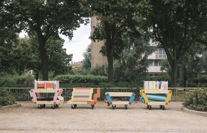 Livraison du projet du "Kit des 1000 premiers jours" pour la Direction des espaces publics du département de la Seine St Denis. C'est un projet de chariots qui se déploient en extérieur et dans l'espace public pour accueillir les services des PMI de quartier de la Courneuve et des Lilas.