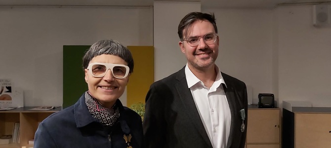 matali crasset, designer, a remis l'insigne de Chevalier dans l’ordre des Arts et des Lettres à Martial Marquet, une distinction attribuée par le Ministère de la Culture.