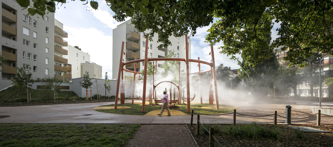- La traverse ludique : une aire de jeux de 140m de long développée en concertation avec les enfants du quartier et la Balancelle des brumes un ensemble de cinq balancelles réunissants mouvement, lumière et brumisation pour créer un lieu de pause et de fraîcheur.