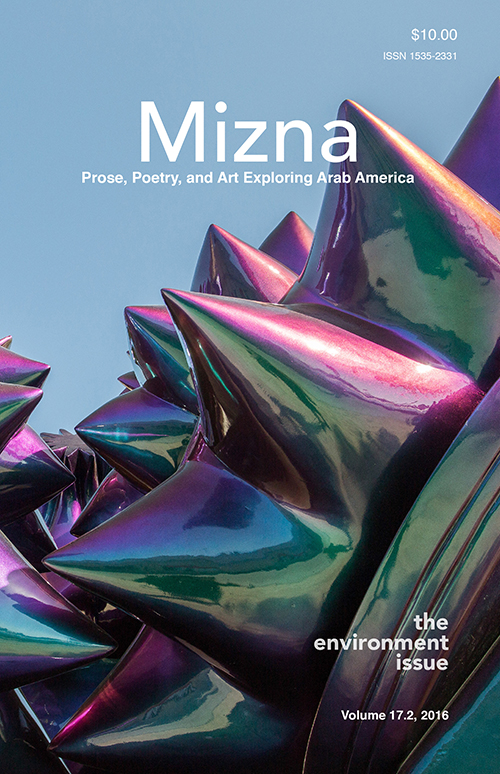 Winter 2016 Issue with an Environment them, this issue is Guest Edited by Gary Paul Nabhan and features works from Rasha Abdulhadi, Rizwan Akhtar, Suzan Boulad, Tami Mohamed Brown, Sharif Elmusa, Catherine Fletcher, Eman Hassan, Marwa Helal, Farah Kader, Joe Kadi, Dawud Mulla, Naomi Shihab Nye, Hamad Al-Rayes, Nida Sinnokrot, Moheb Soliman, and Kenny Strickland. Visual art by Monira Al Qadiri.