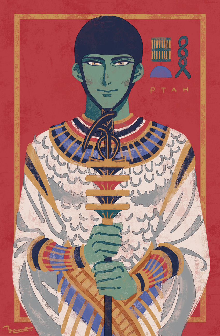 There is not all that much fan art of Ptah out there. From modern interpretations, Ptah tends to get overlooked by the more well-known deities of the nearby Jwnw (Heliopolis) Ennead. From a Memphis theological perspective, he’s up there with my beloved Jwnw Atum as the ultimate creator god, and as always, the flexible syncretic…