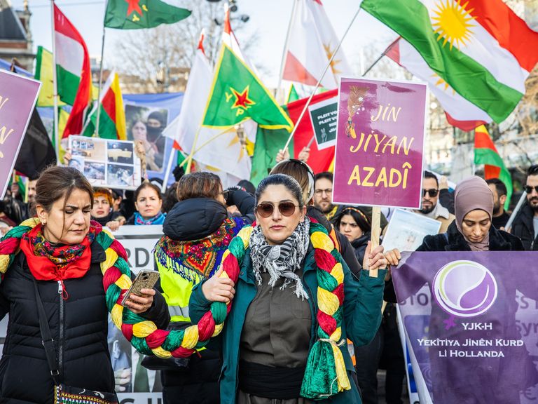 De demonstranten vragen aandacht voor de dreigende situatie voor Koerden in Syrië. Er was een opstootje bij het protest in Amsterdam.