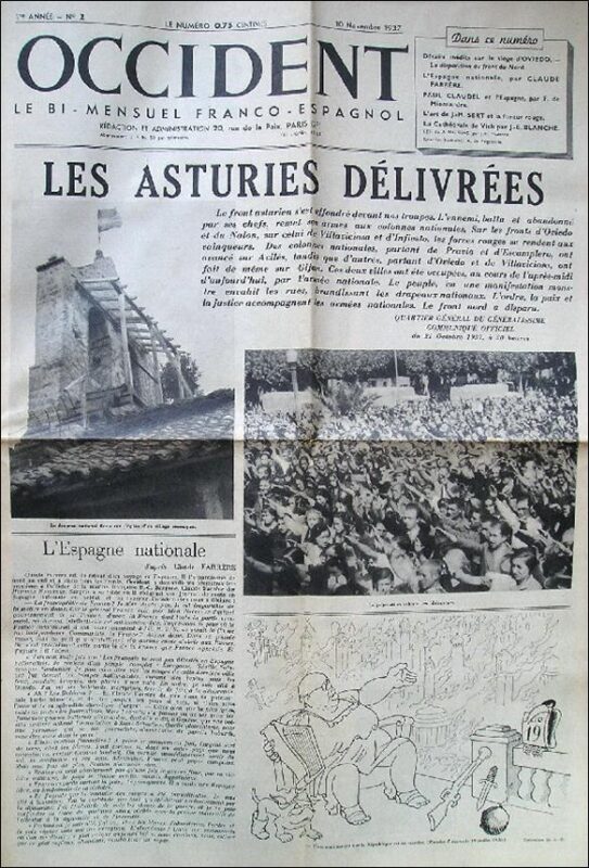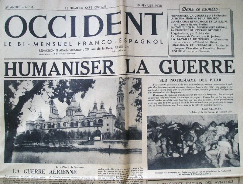 Additionally, we have in our inventory two important publications from abroad, covering the war in great detail. The first of these was published in Paris for much of the duration of the war. Occident: Le Bi-Mensuel Franco-Espagnol. Year I, no. 1 (25 October 1937) through Year II, no. 39 (30 May 1939) (all published). Paris: Imprimerie Georges Lang, 1937-1939. Folio (58.5 x 38.5 cm). 1/2 leather with marbled boards, original illustrated newsprint self-wrappers bound in; each issue approximately 8 pp. Evidence of previous folds, some light abrasions and edgewear to boards, minor splitting to leather along spine, very minor toning, overall very good. (