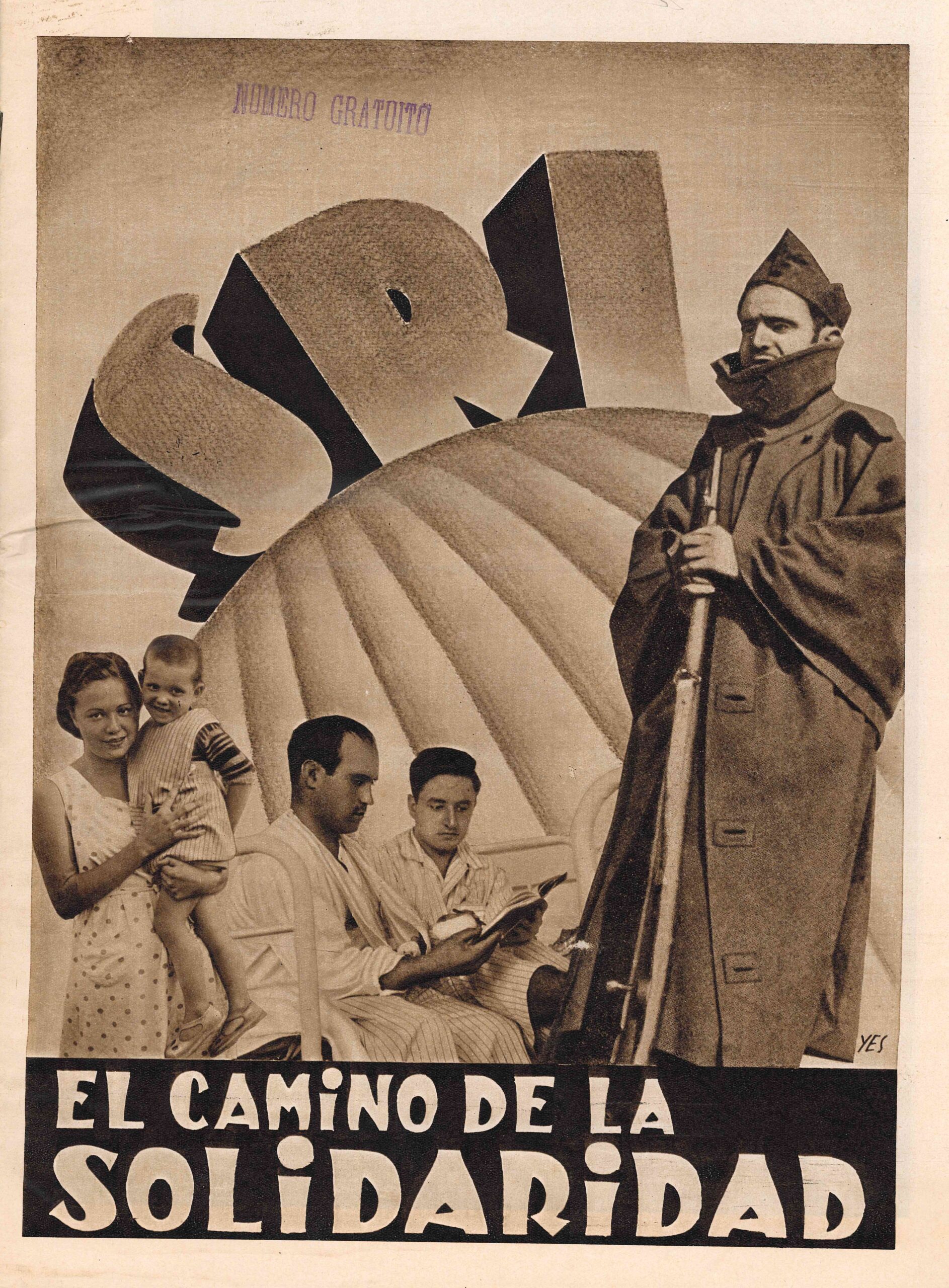 SRI: El Camino de la Solidaridad. Unpaginated [40 pp.] magazine published during the Spanish Civil War by the Socorro Rojo Internacional (SRI, or International Red Aid), profusely illustrated. Small tabloid (14 1/2 x 10 5/8 inches). Original photomontage illustrated saddle-stitched wrappers. “Numero Gratuito” rubber-stamped to top of front cover, some light edgewear and minor chipping, crease along horizontal fold, light dust-staining to margins, overall very good. Madrid: Editorial Estampa, 1937. (