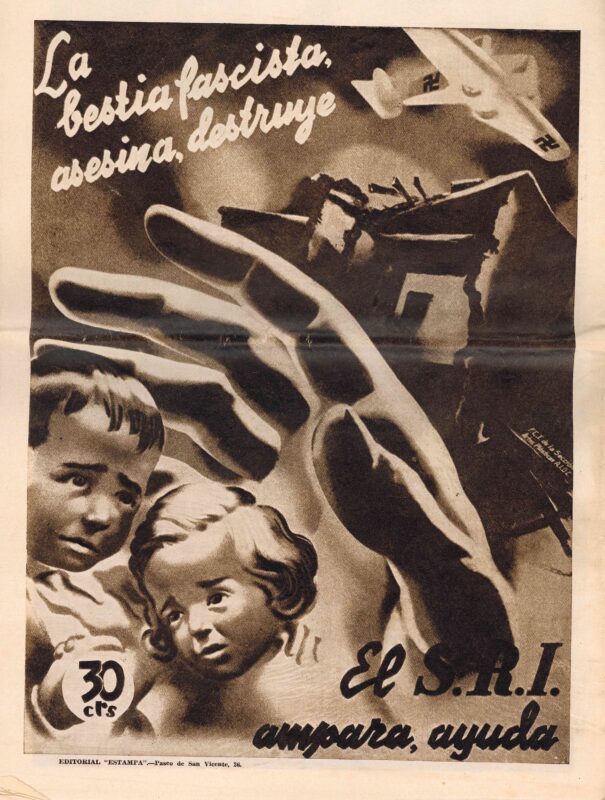 This scarce Spanish-language magazine was a one-off publication, issued just six months after the start of the Spanish Civil War. It was published on behalf of the SRI (Socorro Rojo Internacional, or International Red Aid), a Spanish-Soviet organization formed by the Comintern, or Communist International, in 1922. The SRI was created to function as a sort of international Red Cross, independent of any religious organization, and in Spain was mostly involved in aid activities in the Republican zone, such as creating and running refugee camps, soup kitchens, libraries for soldiers, mobilization of dentists to the front, organization of charity drives for food and clothing, transportation networks between hospitals and the front, and the repurposing of various buildings into field hospitals, blood banks, and makeshift schools. Many of their activities had children as a central focus. (The Visual Front: Posters of the Spanish Civil War from UCSD’s Southworth Collection, 1998)