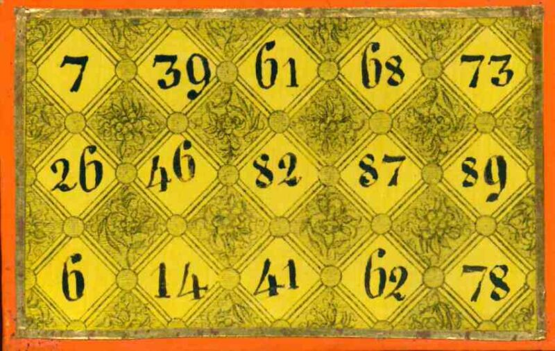 The third object which also dates most likely to the 19th century is an antique ‘tombola’ game from Italy. ‘Tombola’ is a traditional Italian game very similar to bingo, first played in Naples in the 18th century. This set is comprised of a cardboard game board with 90 gold-numbered spaces on red paper in an embossed gold paper frame, 90 hand-numbered wooden game tokens, and 87 total individual cards in 15 sets, the cards also hand-numbered. Traditionally, players would cover the numbers on their individual cards using beans, lentils, or pieces of citrus peel as markers.