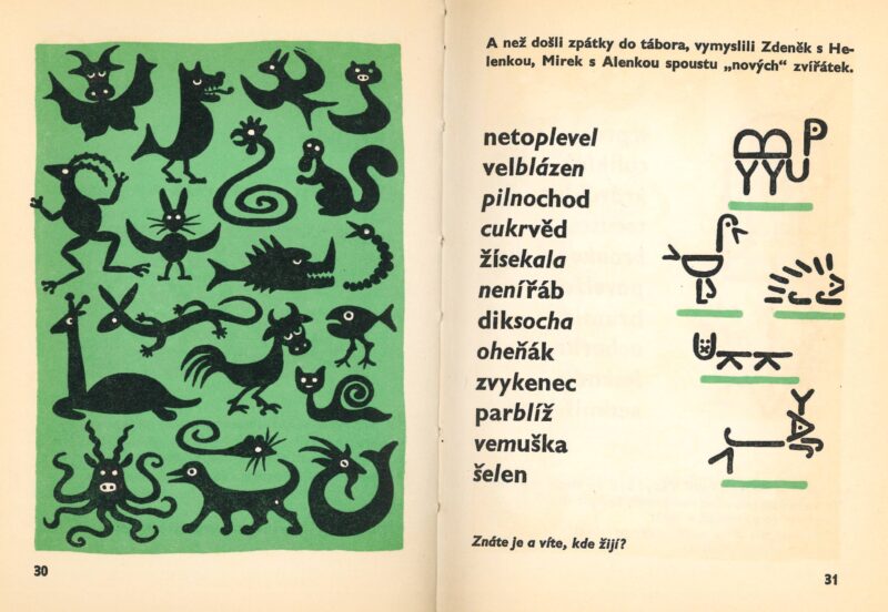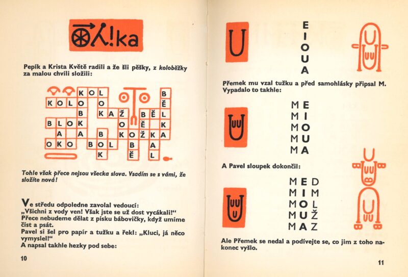The final item in this collection is a quirky work of Czech concrete poetry designed as a whimsical children’s book. Co se slovy všechno poví was published in 1964 and contains poems by Josef Hirsal and Bohumila Grögerová, foremost representatives of concrete and experimental poetry in mid-century Czechoslovakia. With illustrations by Věra and Pavel Brázda, the book is a playful exploration of word-based games that children play on a train ride, full of visual poems, full-page colorful illustrations, and two-color letterpress designs set by Josef Dolezal.
